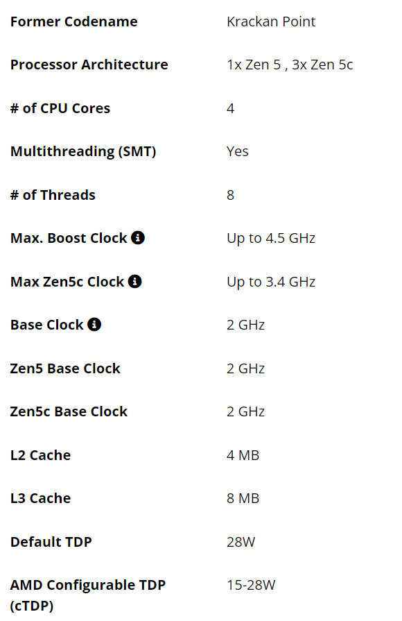 这款处理器基于Krackan Point 2架构,专为低预算市场设计,拥有1个Zen 5核心和3个Zen 5c核心,总共4个核心,支持SMT技术,因此拥有8个线程。