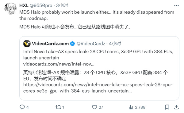 最初的计划是Arrow Lake产品,不过最后Arrow Lake的Halo产品线被取消,但计划本身仍在进行中,那就是Nova Lake-AX。