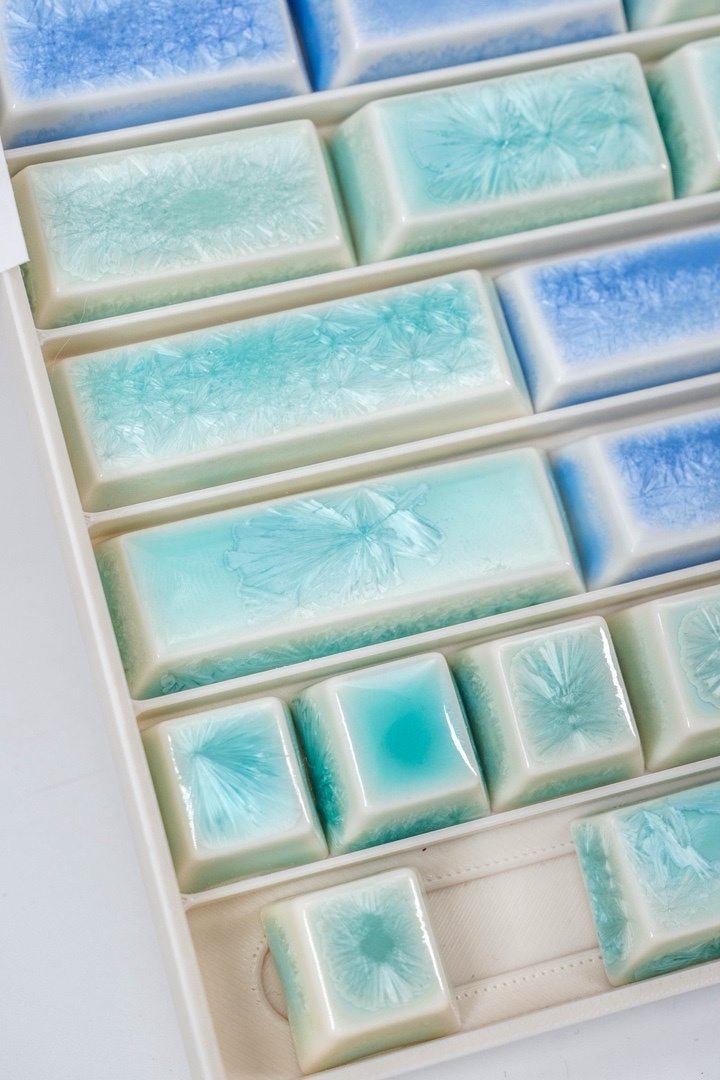 真的超级难烧,键帽难烧,结晶釉这种吃温度的釉就更难烧了,这么久连一套豆凑不出来,几百颗就出来这几颗成品,真的太难了。