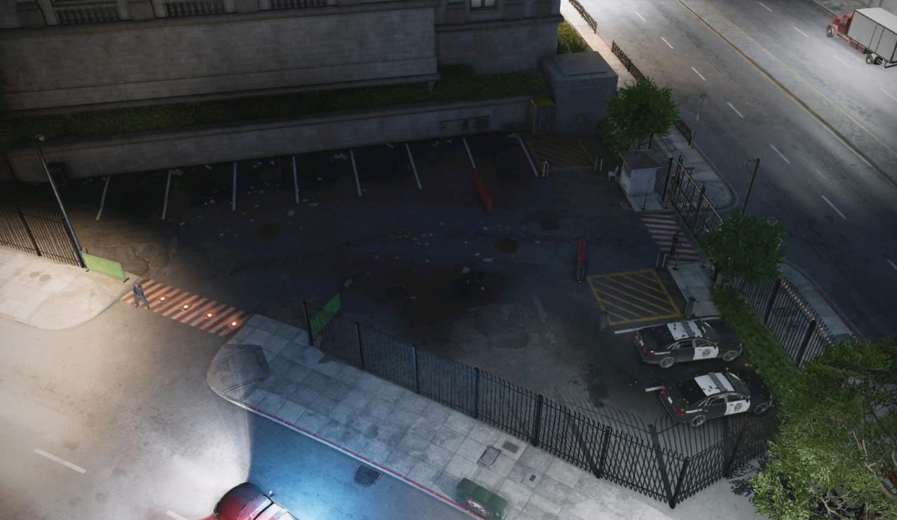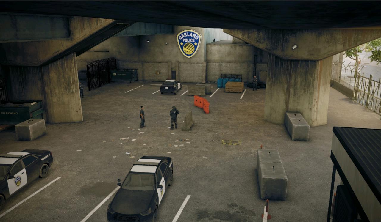 位于奥克兰区,就在奥克兰警局的对面,一个桥下的大型停车场,它是所有警方管制区域里戒备最森严的,里面除了巡逻的警察外还有一名特警和一名重甲特警驻扎。