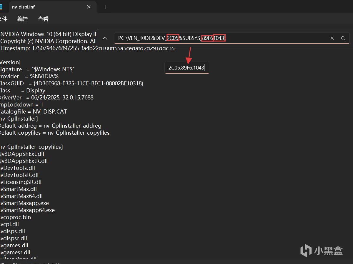 五、打开文件按ctrl+F打开查找,粘贴我们第一步里复制的硬件ID并对ID进行删减只留这三串数字,并在这三串数字中间加半角的句号;