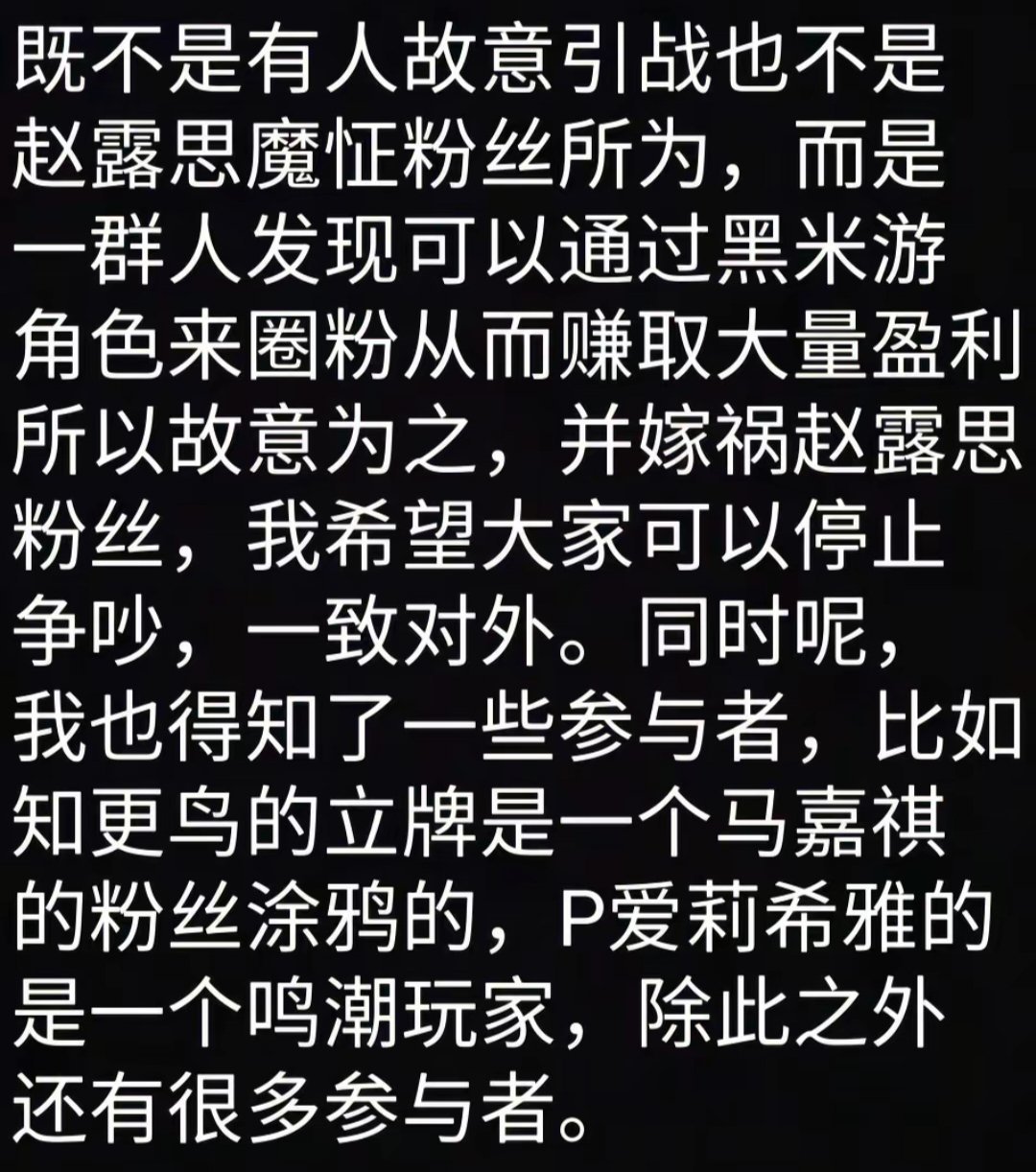 事件发生后,崩铁圈玩家纷纷到zls评论区底下讨要说法,要求zls工作室公开道歉,此举遭到了zls极端粉丝的不满,极端粉丝群体开始制作角色鬼图、AI换脸视频等恶俗手段来抹黑米家系其他二次元角色,至此知更鸟立牌恶意涂鸦事件彻底激化,双方粉丝群体开始了无休止的对线