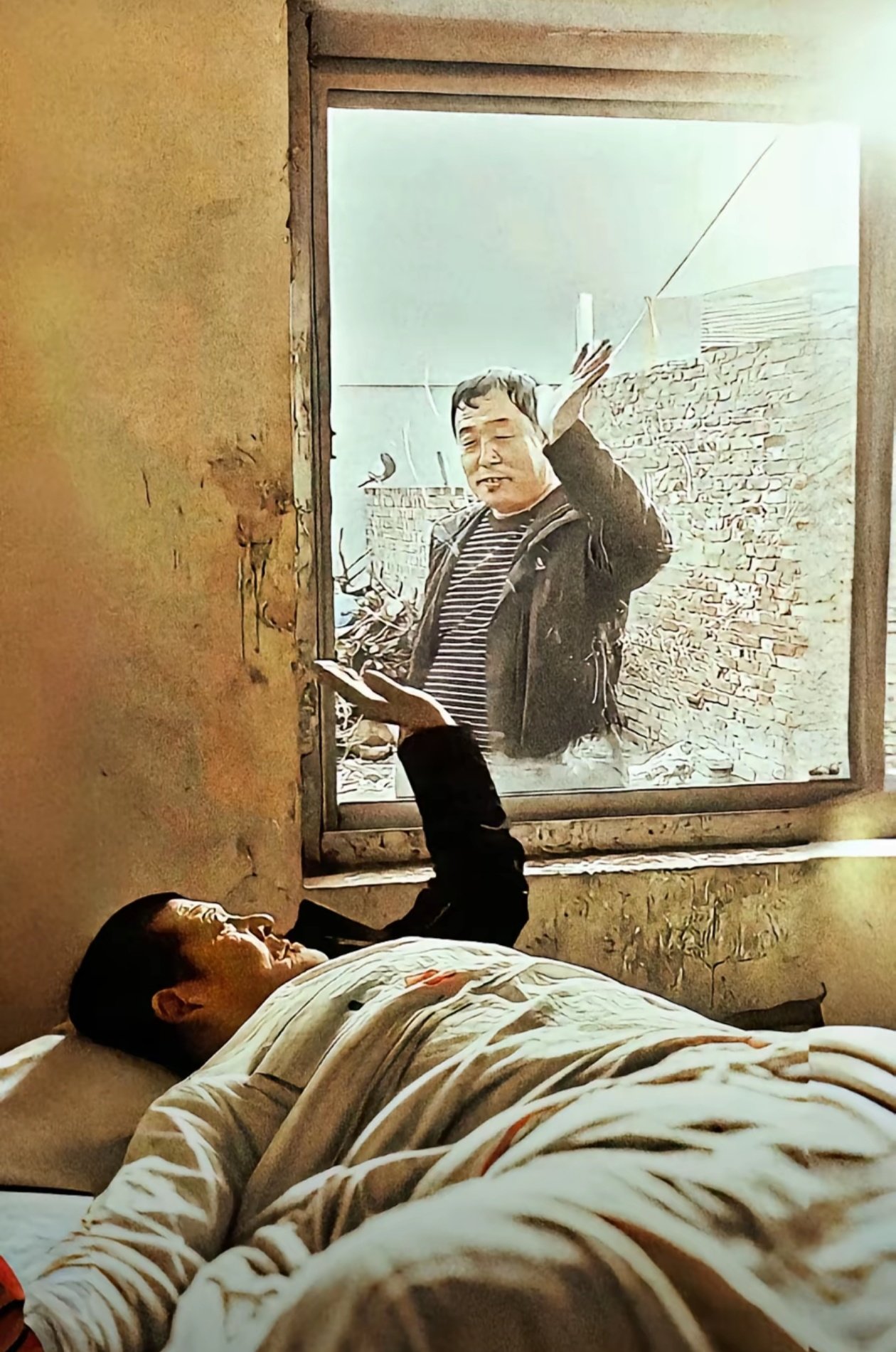 我们回看民哥的一生,民哥三岁丧父,十岁丧母。或许是上天怜他苦海无岸,便轻轻合上他认知世界的窗——从此,他的光阴永远停驻在十岁那年的灶台前。二峰的镜头里,他总在灰扑扑的床沿旁包细菌馅饺子,从不打扫房间毫无生活经验的民哥却能熟练的包起饺子,因为这是妈妈教给他的生存之道,母亲早把整个宇宙的温柔,包进了饺子里