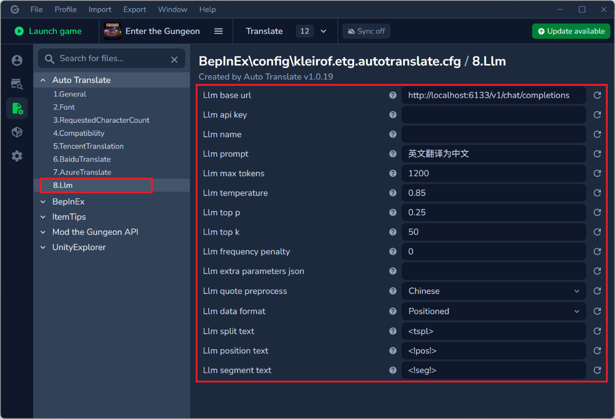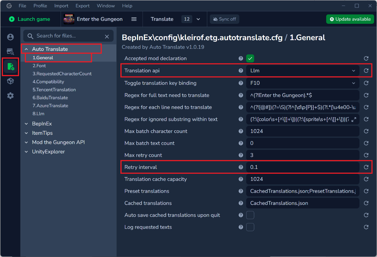 在模组管理器中,此处以Gale管理器为例,在配置- Auto Translate - General,选择Translation api为Llm,下方Retry interval为0.1。