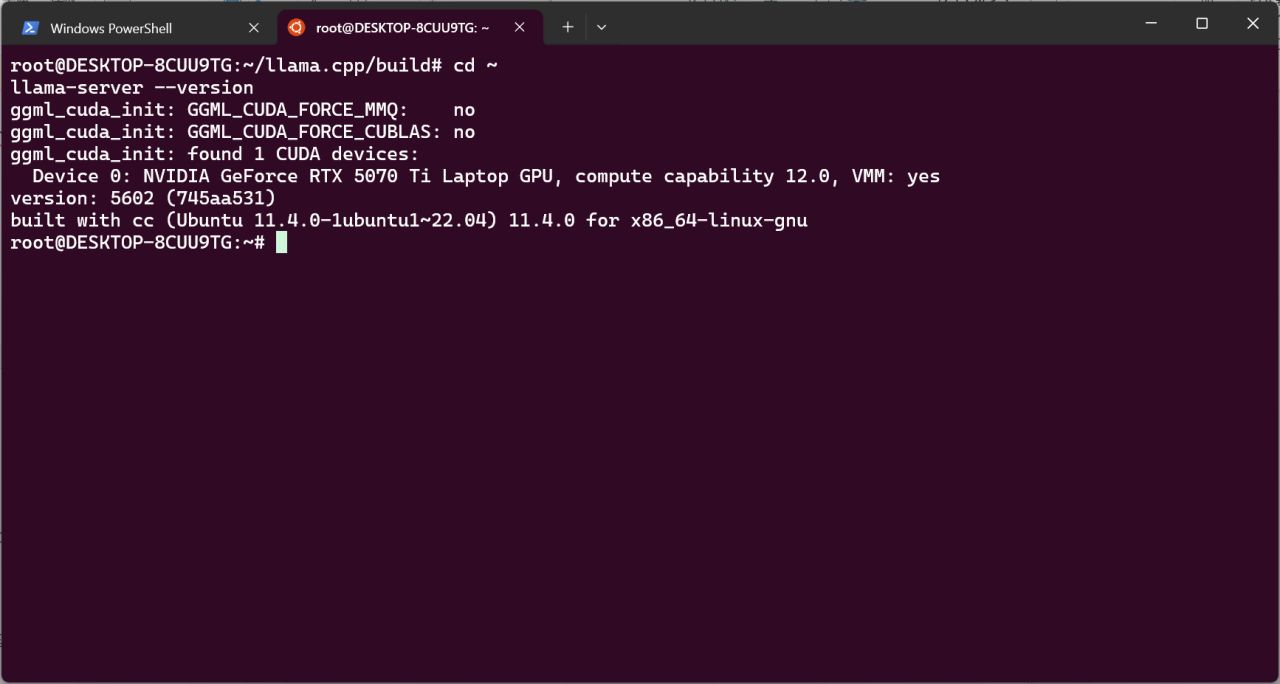 优先选择用WSL进行llama.cpp服务的搭建,它比Windows直接使用llama.cpp性能更好。需要注意的是,WSL开启后会启动Windows的虚拟机平台,请权衡利弊,介意的可以用Windows直接使用llama.cpp,但是显存优化没那么好。
