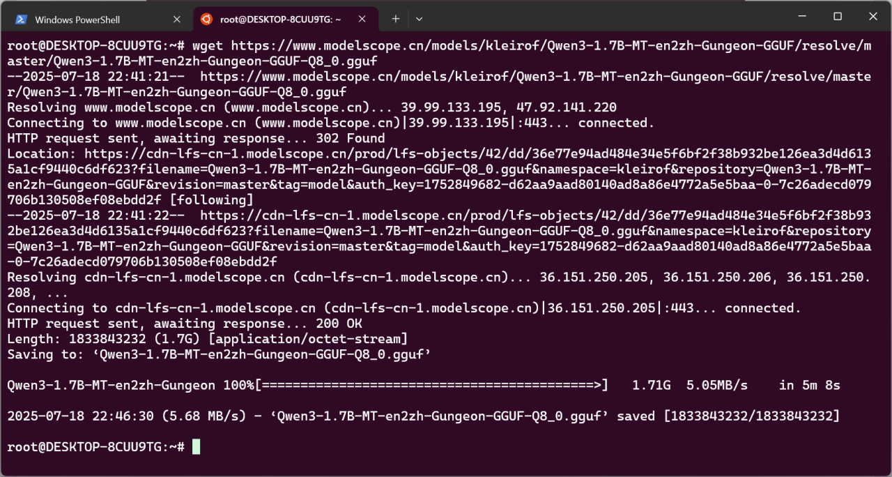 下面下载Qwen3-1.7B-MT-en2zh-Gungeon模型。量化模型发布于ModelScope: