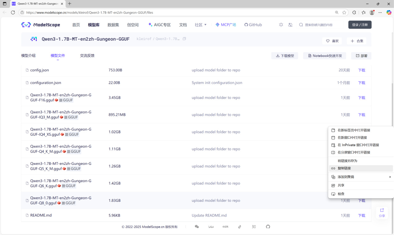 不同量化程度的模型具有不同的精度和推理速度,此处以Q8_0量化为例。下面把模型放到WSL-Ubuntu中。在模型的下载处右键 - 复制链接。