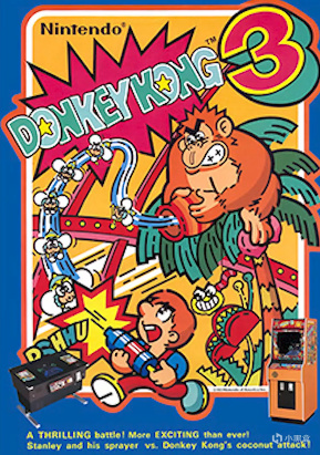 接着是在83年10月推出的《大金剛3》,主角這次不是馬里奧了,但大金剛再次出演反派,玩法改變成了射擊類型。大金剛會從蜂巢裏放出蜜蜂和蟲子來攻擊你,你需要操縱小人從下方攻擊大金剛並保護花朵。突然改變了玩法的大金剛3銷量與口碑雙失利。再後來1983年FC,也就是紅白機橫空出世後,《大金剛》《大金剛Jr》首發登陸FC,《大金剛3》也在84年登陸。這些都足以見得任天堂當時對大金剛的重視程度和玩家對他的喜愛。