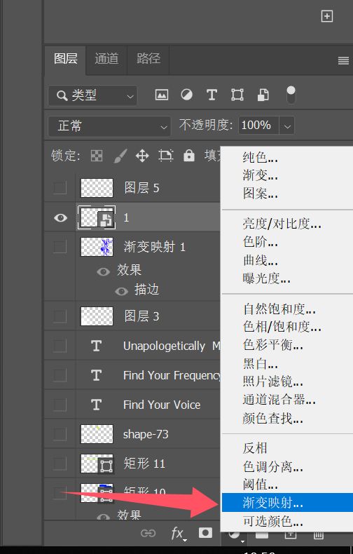 映射渐变和蒙版都在这个属性栏中,请点击左边的映射渐变图标