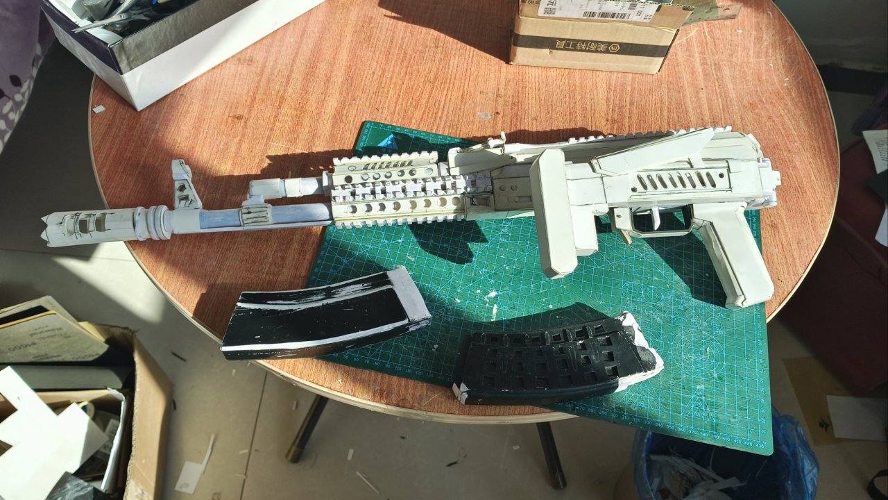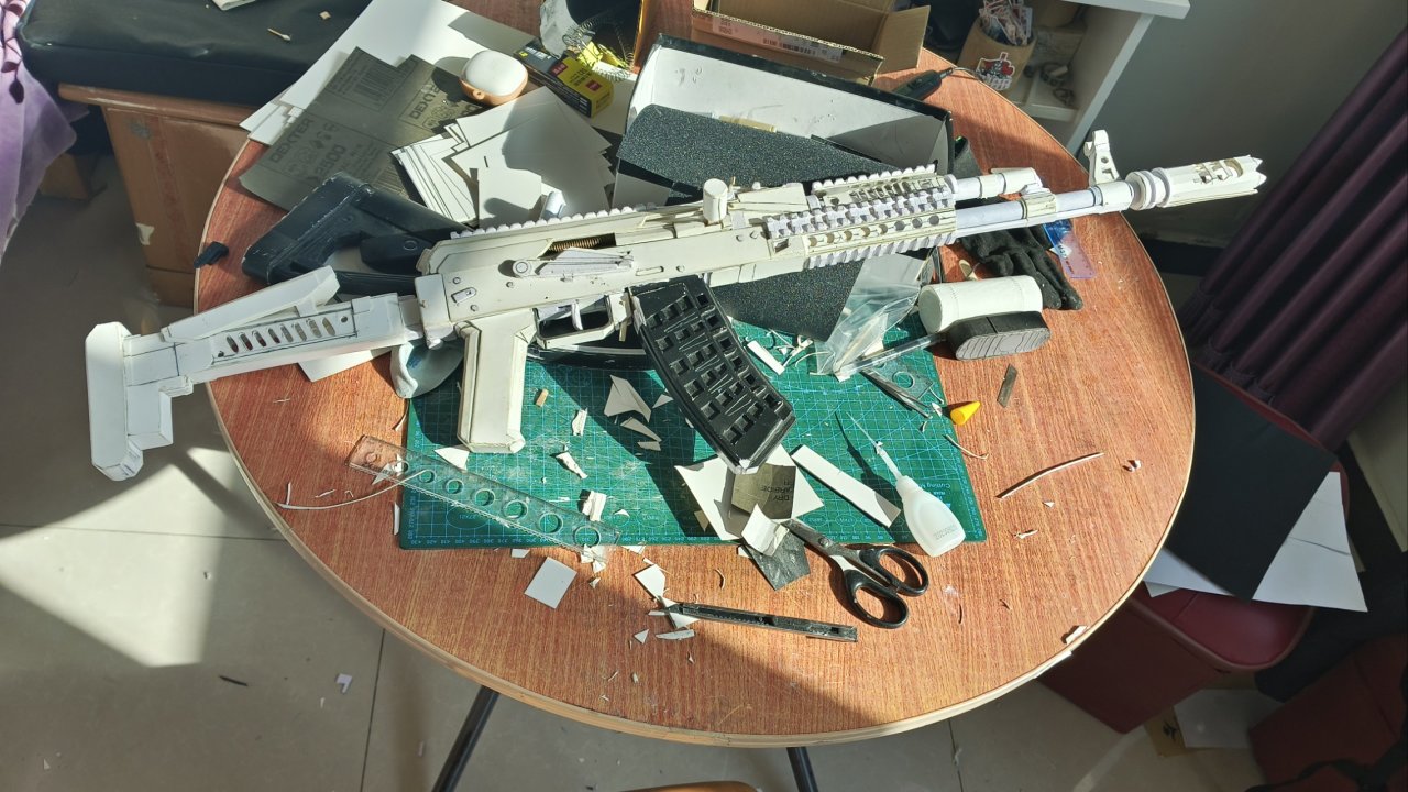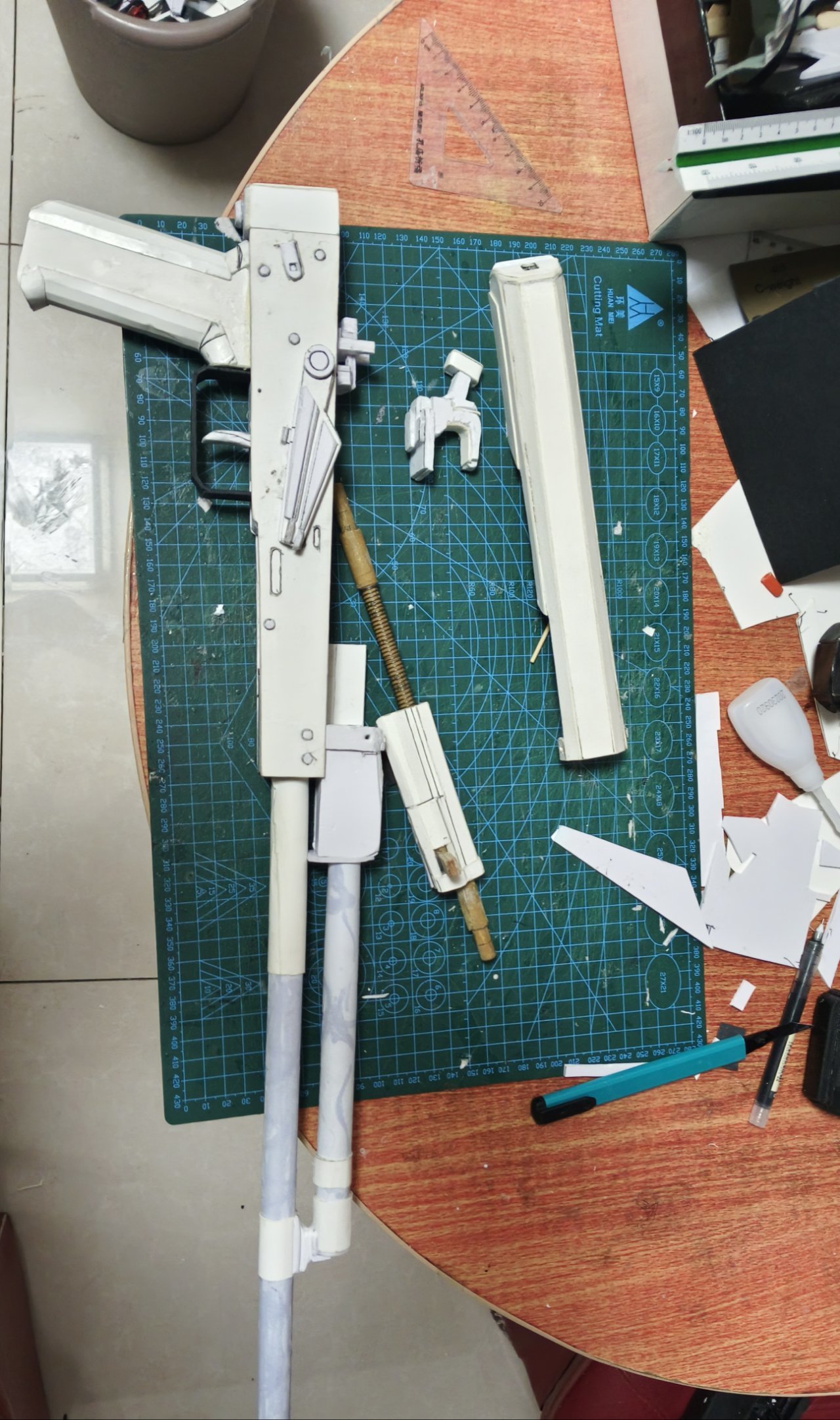 去年暑假做的,大概做了两周,使用雪弗板和白卡纸,502胶水连接。快慢机三档可动,扳机造型做错了,弹匣可前挂后卡,有误差,弹匣后卡的地方只能凹进去卡,加了弹簧可动拉机柄,后托可折叠,皮卡丁尼导轨适配水弹玩具用的时尚小垃圾,不可发射,纯粹把玩和挂墙模型