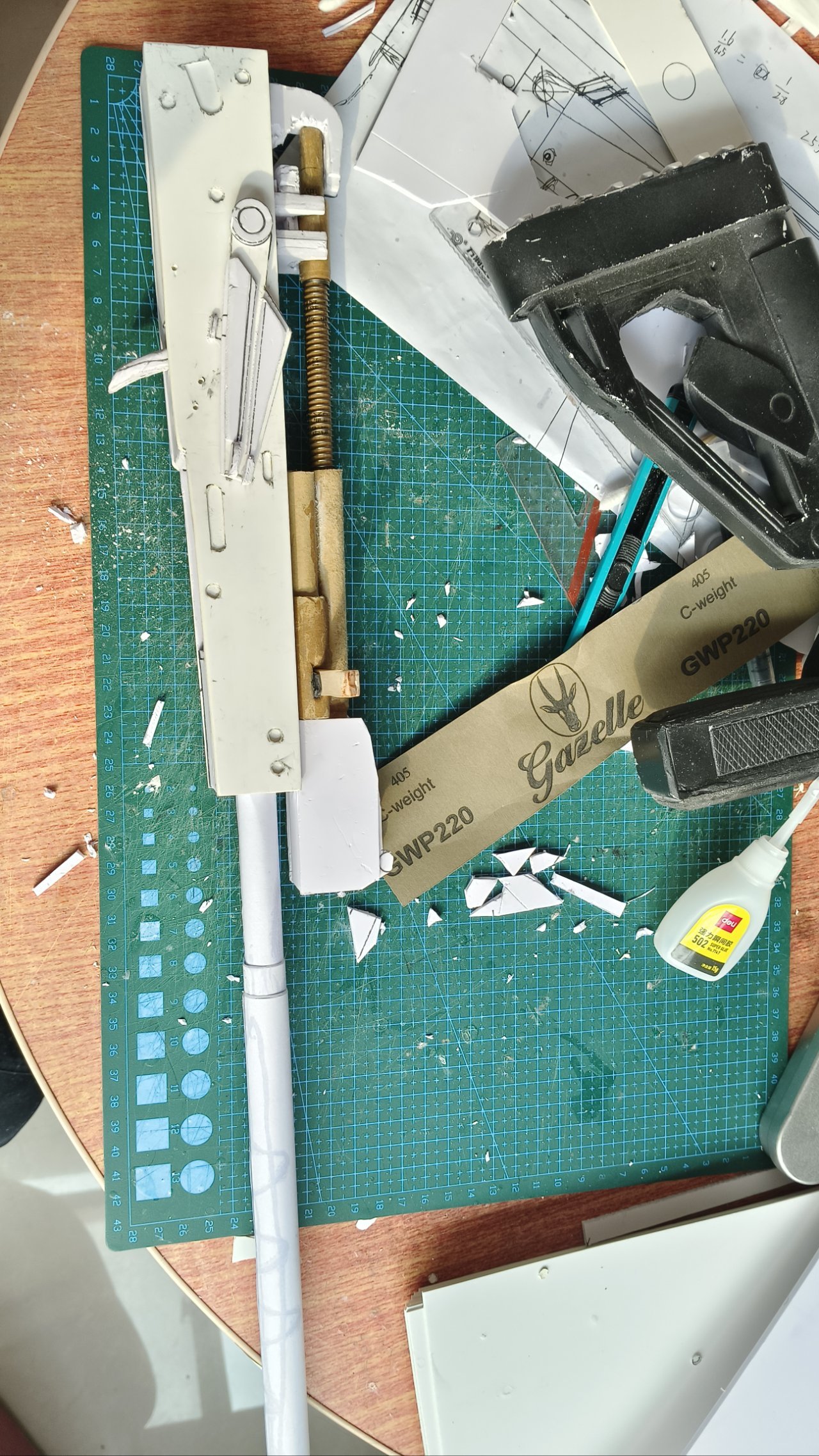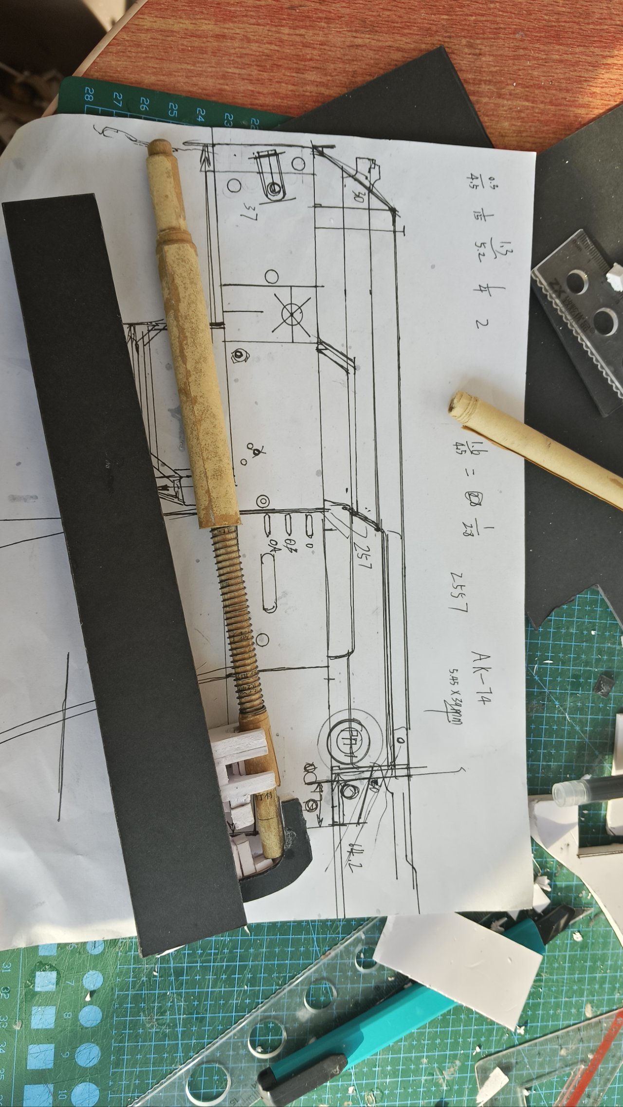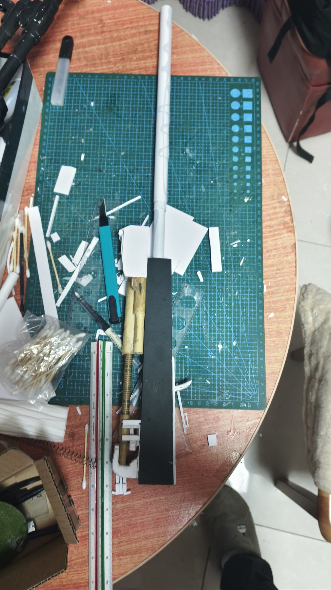 去年暑假做的,大概做了两周,使用雪弗板和白卡纸,502胶水连接。快慢机三档可动,扳机造型做错了,弹匣可前挂后卡,有误差,弹匣后卡的地方只能凹进去卡,加了弹簧可动拉机柄,后托可折叠,皮卡丁尼导轨适配水弹玩具用的时尚小垃圾,不可发射,纯粹把玩和挂墙模型