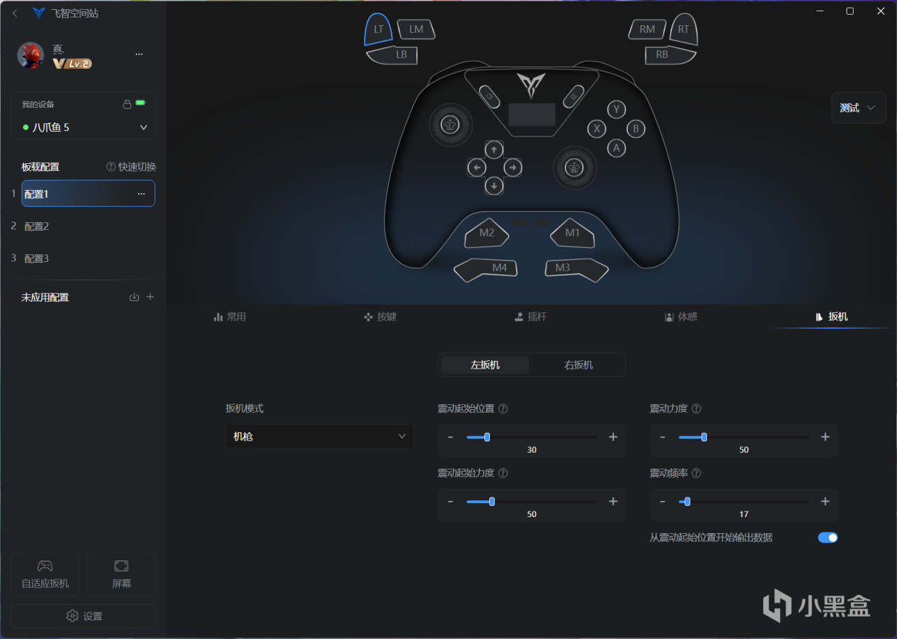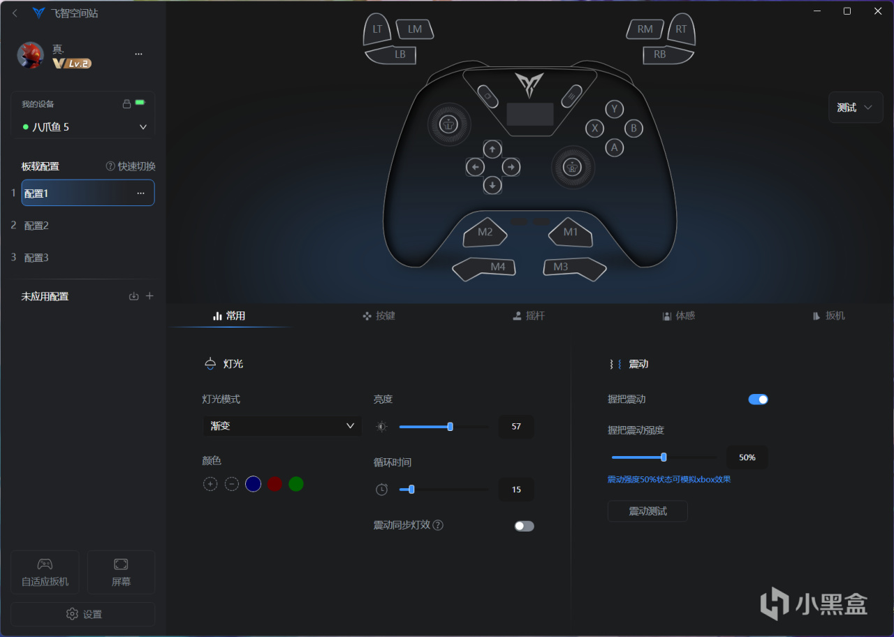 在默认配置界面我们可以调节灯光效果和震动强度、连发、宏设置、摇杆映射以及灵敏度曲线、更细致的扳机设置。此外最方便的应该是在手柄中按下o+abxy按钮可以快速切换板载设置,相当方便。