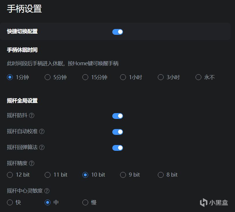 以及查看自适应扳机支持的游戏、更高屏幕的图片,手柄的快速设置如休眠时间、摇杆设置防抖、自动校准、回弹算法、摇杆精度、中心灵敏度,可以根据自己的需求开启。可以检查固件升级