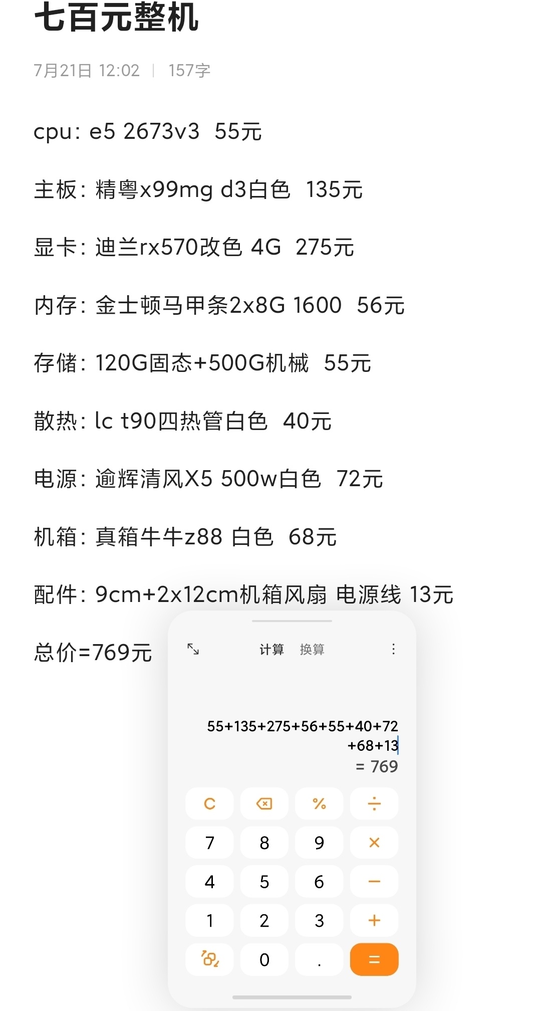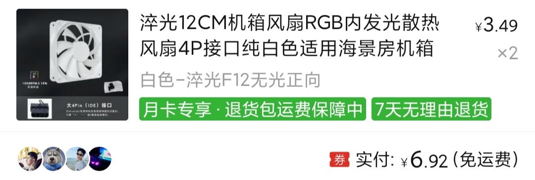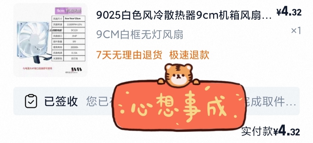 配件有电源线(pdd2元购入)、9cm无光白色机箱风扇(tb4元购入)、12cm无光白色机箱风扇x2(可有可无,pdd7元购入)