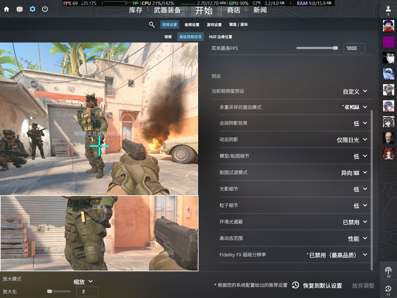 《cs2》4:3 1280-960 画质预设如图 人机房120-150帧左右(帧率偏低了感觉是cpu跟显卡偷懒了)