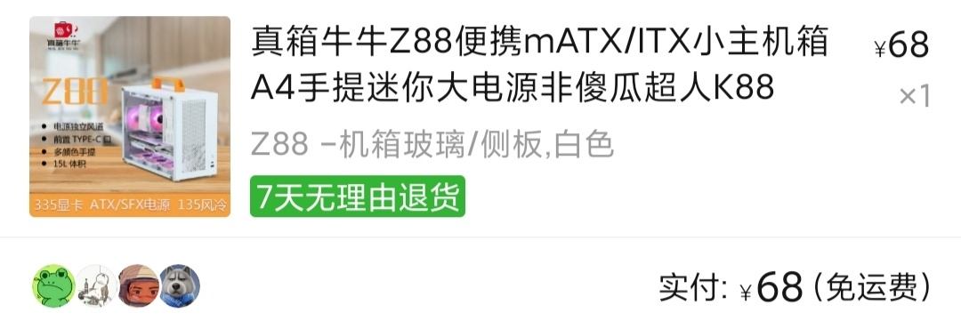 机箱采用上期同款真箱牛牛z88,pdd68元购入,白色机箱搭配橙色手提把,配色很清新颜值高。hy也可以自行购买同价位的手提机箱,如鱼巢s5max等,购买前注意机箱的电源风道是否为独立的,机箱内部散热本来就不好,还要跟机箱内部抢风。