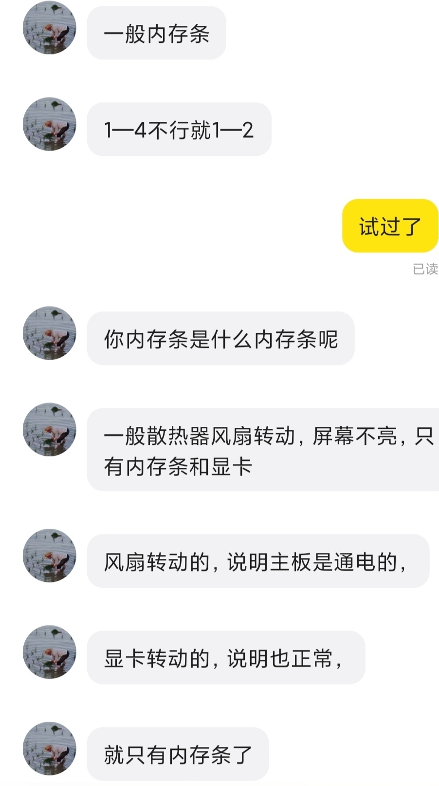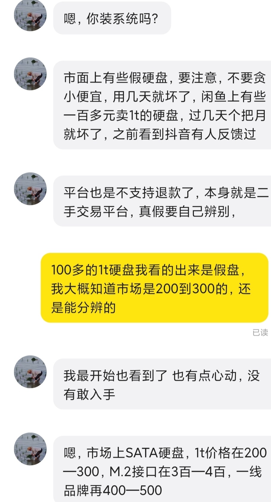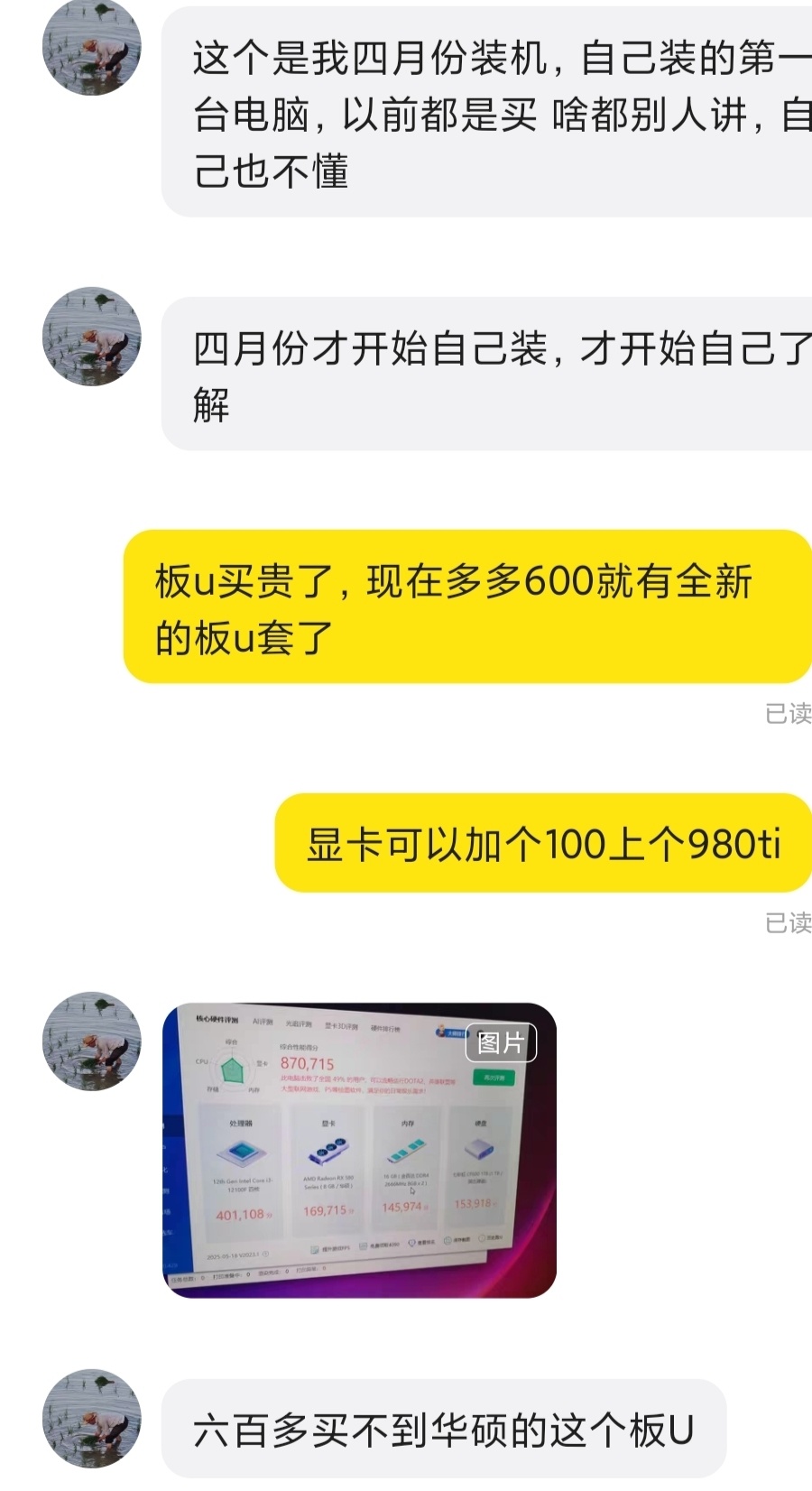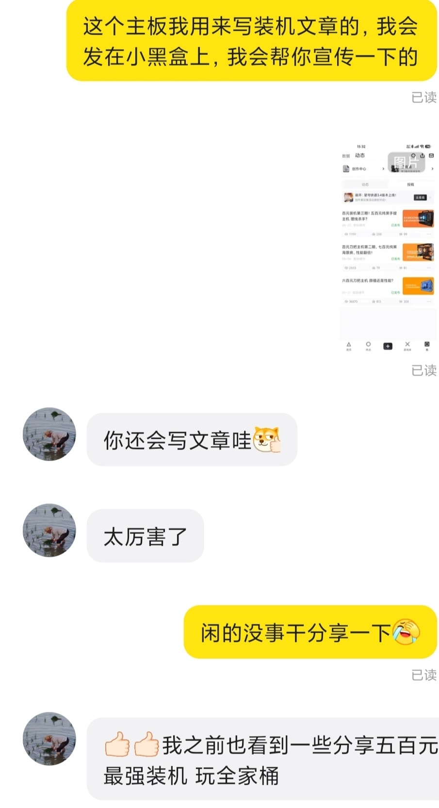 与卖主板老板的畅聊:事情是我询问买的这个m2固态是否能用,然后还告诉了我不少固态的辨认知识,还分享了自己不少日常,还说起自己的装机历程,最后我装机的时候发现死活点不亮也是老板一边慢慢尝试点亮的。老板是个诚实人,卖的东西也很不错,**意以后来他那买能打包给我便宜。