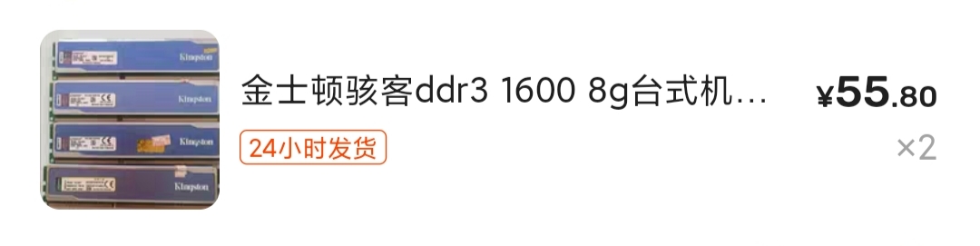内存采用金士顿马甲条两根,小黄鱼56元购入,8+8组双通道16G,预算紧张的可以用往期同款的金士顿马甲条4G代替。
