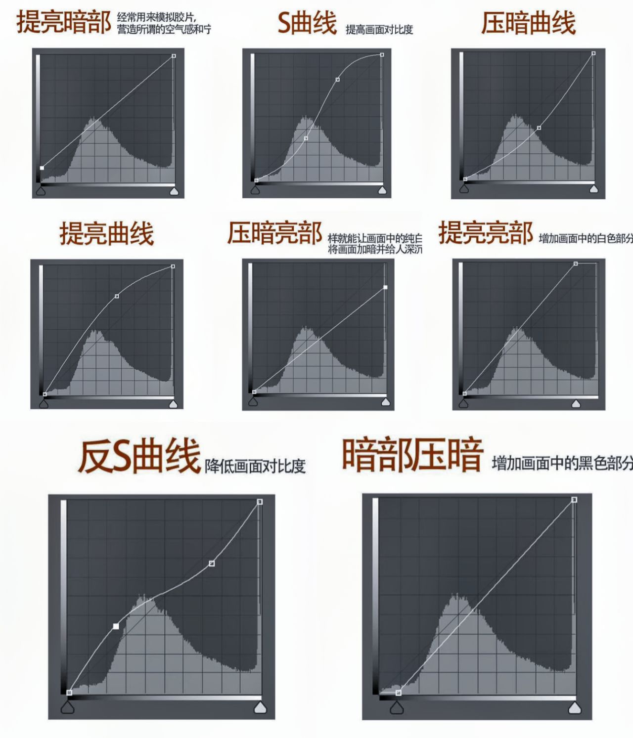 而曲線的橫軸是原圖的亮度,縱軸則是調整後的亮度。總的來說,它們調節的是畫面的亮度分佈。