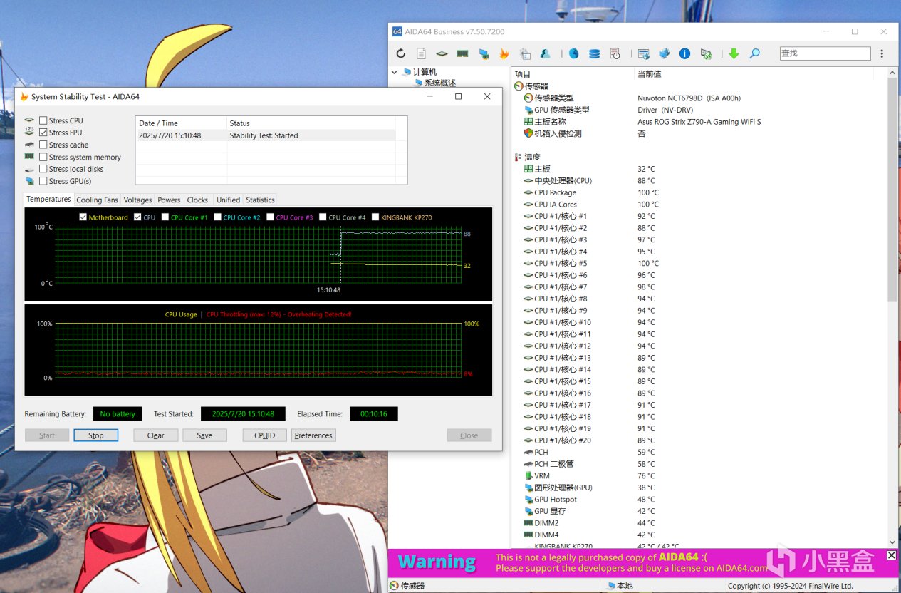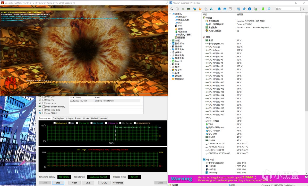 双烤CPU和显卡13分钟,CPU温度在88°,显卡最高温度在65°。
