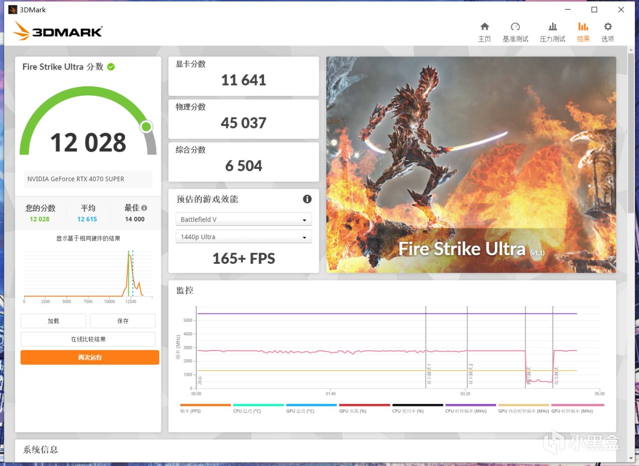 用3DMARK测试,在Fire Strike Ultra测试中,得分12028分,显卡分数11641分,物理分数45037分,综合分数6504分。