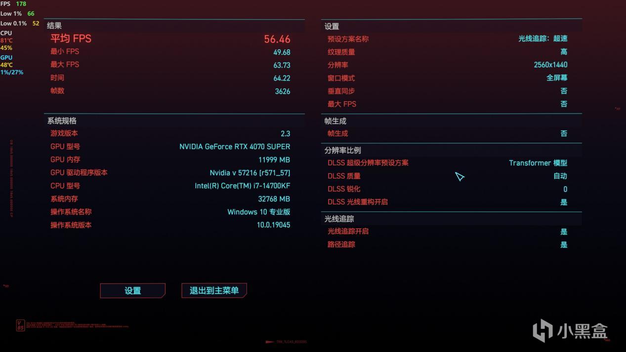 在赛博朋克2077中,光线追踪:超速模式下,平均帧数为56FPS。
