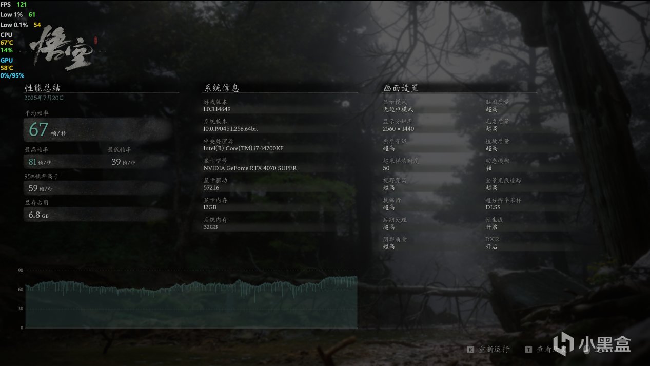 在黑神话悟空性能测试中,50%采样率,开启DLSS和帧生成,超高画质下平均帧数在67FPS。