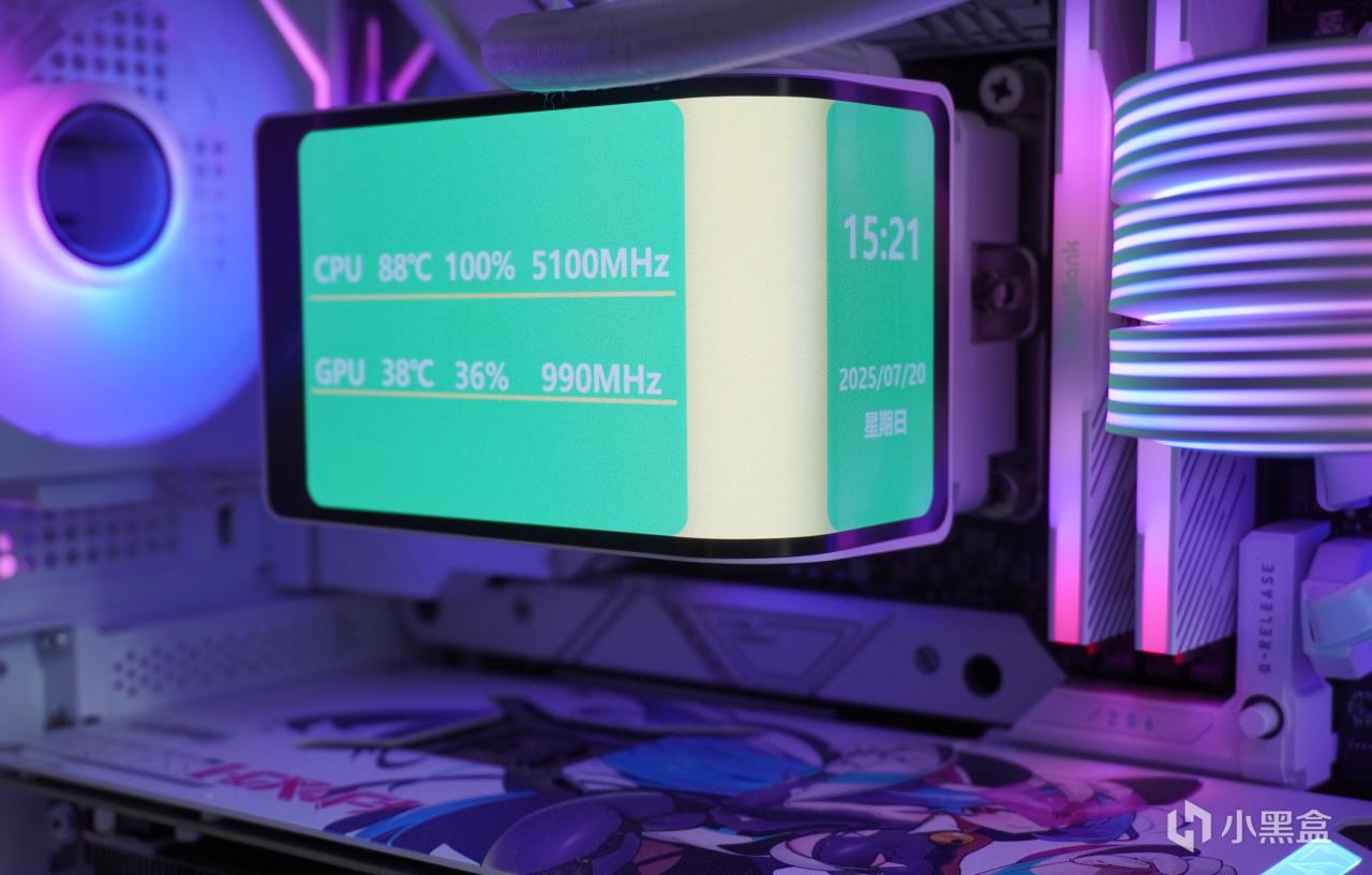 底部的风扇采用的是丛林豹星联360铝片,也是一体式风扇,安装非常容易。侧面有一个小屏幕用来显示当前的转速,还是非常有特色的。侧面的材质是可以做选择的,有铝片、木纹和无限镜三种款式。左右两侧都有一条RGB灯带,支持神光同步。