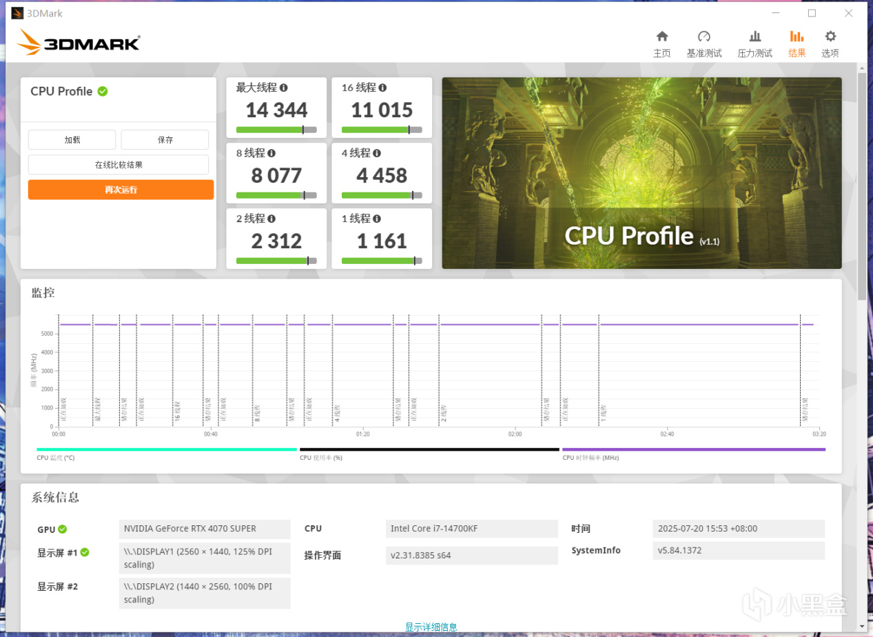 CPU Profle测试中,最大线程得分14344分、16 线程得分11015分、8线程得分8077分、4线程得分4458分、2线程得分2312分、1线程得分1161分。