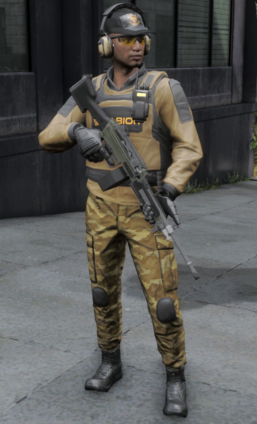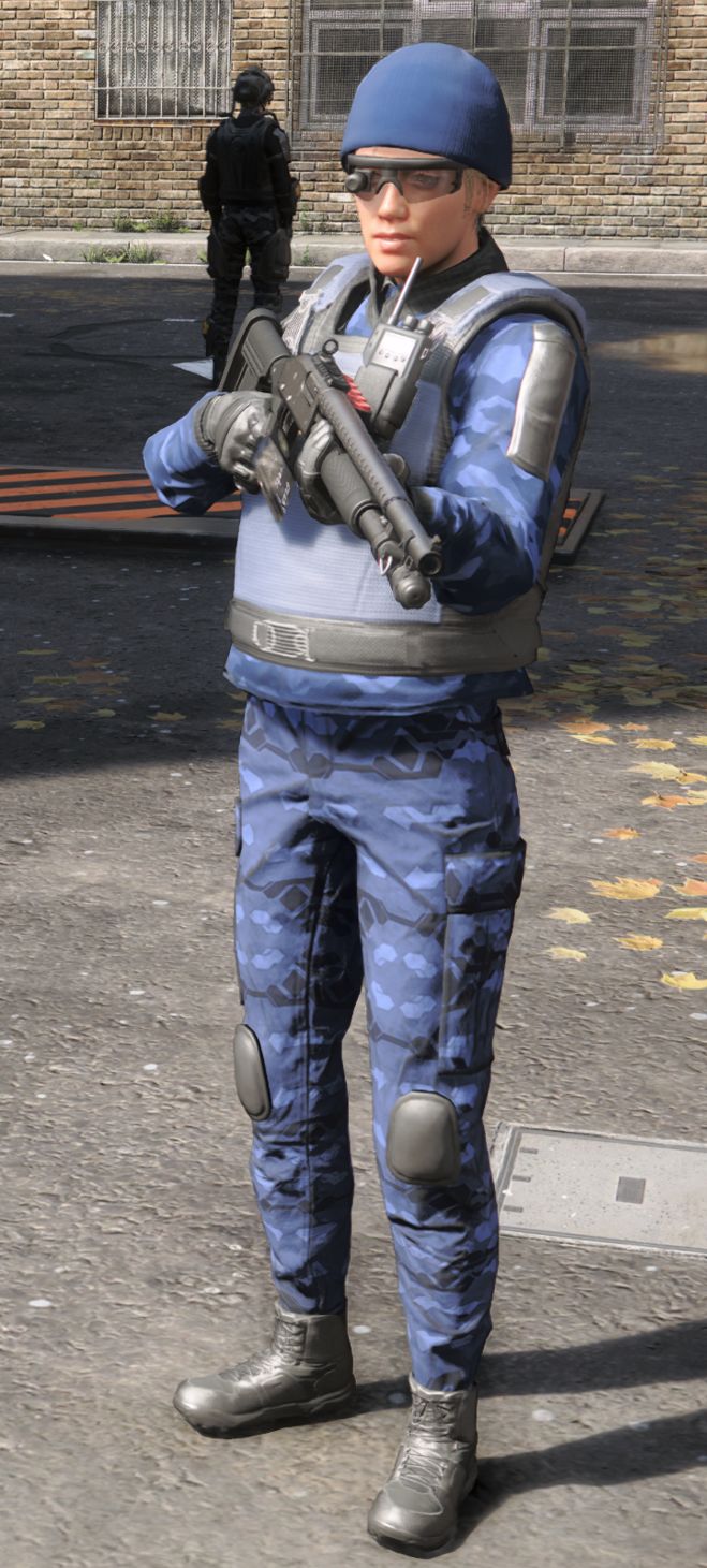 在完成游戏第五章后,精英佣兵会替代他的出场,精英佣兵佩戴了防弹战术头盔,防护性更全面也更强的战斗背心,同时四肢也有护甲保护,除了防护升级外,武器同样也得到了加强,维克托.45 ACP冲锋枪是他们的统一配置,这款射速极高的冲锋枪可以撂倒许多出顾茅庐的叛乱分子。(这套背心实际上更像是PX6战术防暴背心)