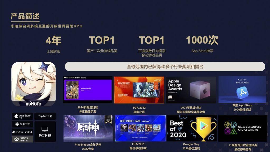 卓越品質爲《原神》贏得了全球範圍內的廣泛讚譽。遊戲上線四年間,持續領跑國產二次元遊戲品類,並已在全球範圍內斬獲超過40項重磅行業獎項。其榮譽殿堂包括極具含金量的TGA(The Game Awards)2021“最佳移動遊戲”、2021蘋果設計獎(視覺與圖像)、2024科隆遊戲展“年度最佳手遊” 等,印證了其作爲上海原創、享譽世界的頂級IP地位。