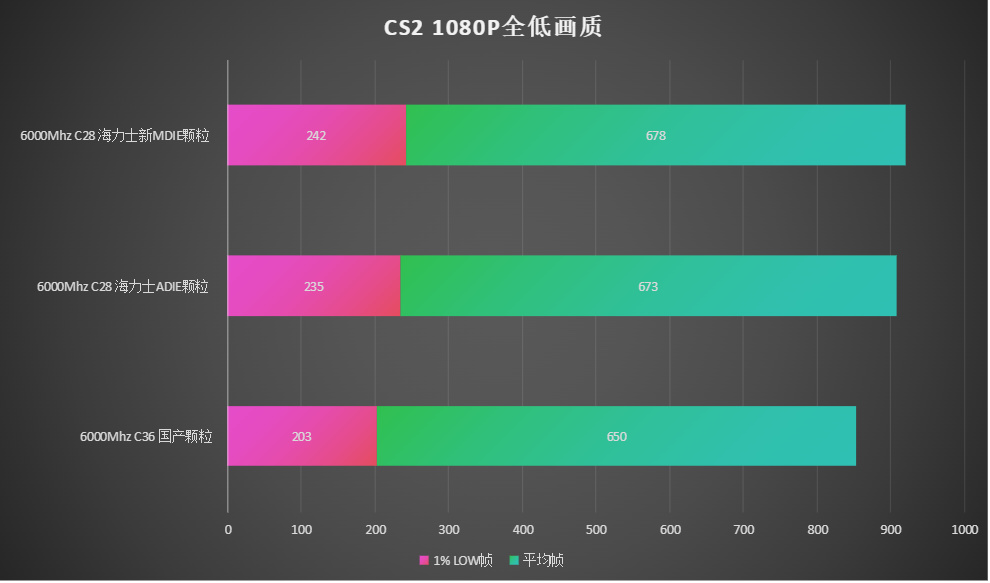 接着是CS2,1080P分辨率全低画质跑创意工坊基准测试,这里海力士颗粒平均帧和LOW帧才会更高一些