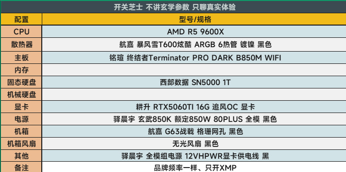 这是之前出的无卡整机,在此基础上加了一张5060TI 16G显卡,应该能模拟主流玩家的电脑,来测试内存颗粒对游戏的影响:3998元9600X无卡整机,好底子战未来!