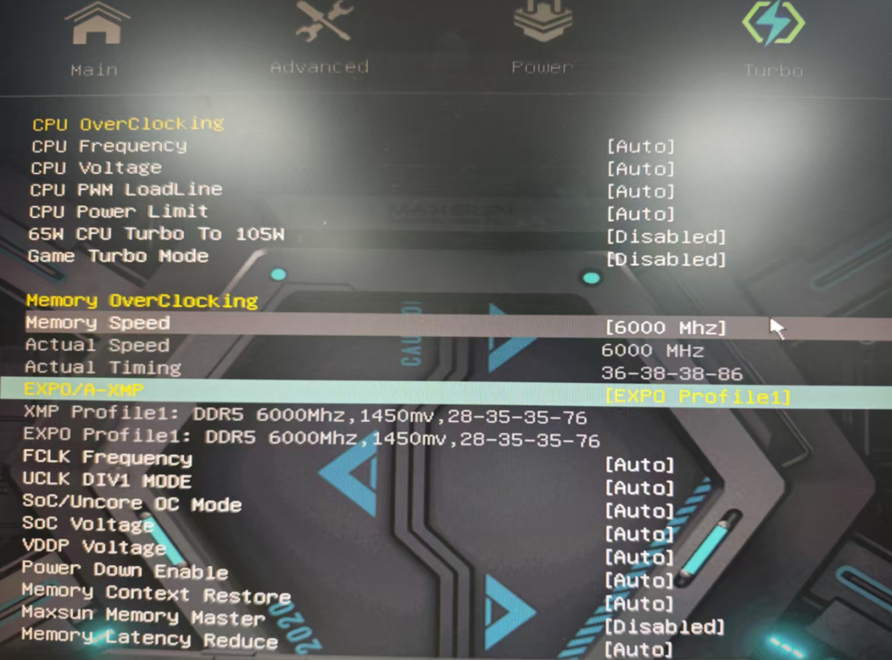 BIOS里只开启内存超频预设(XMP/EXPO),不进行其他超频调参等玄学设置:
