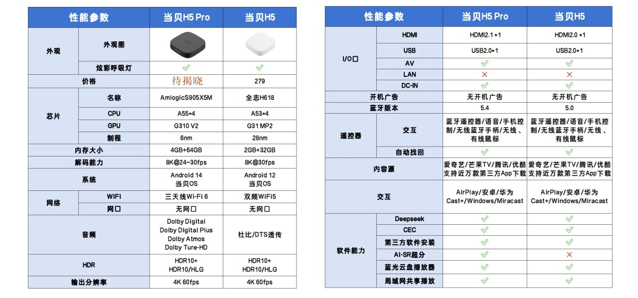 看下当贝H5PRO和当贝H5的各项参数对比,之前当贝H5给我的体验就很棒了,而当贝H5PRO它以极具诚意的升级和依然亲民的价格(约300+元),再次定义了“老电视救星”的天花板。如果你对H5满意,H5Pro的升级绝对超值;如果你想彻底释放家中老电视的潜力,H5Pro就是目前最优解!