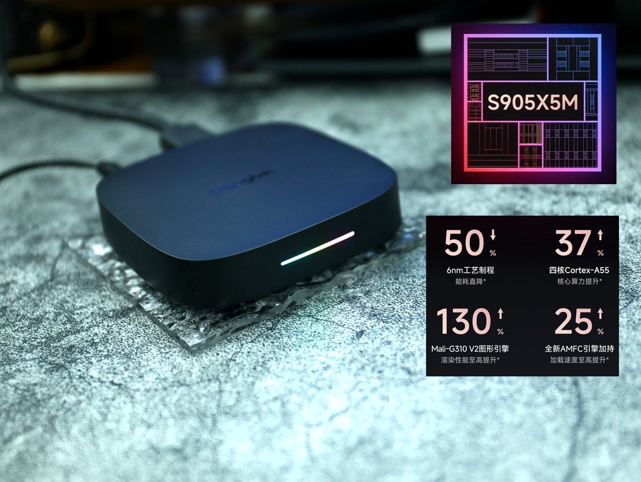 当贝 H5Pro 最核心的升级当属性能方面。它搭载了 Amlogic S905X5M 芯片,采用 6nm先进工艺制程,性能有了质的飞跃。核心算力提升明显,四核 Cartex-A55 架构配合 Mali-G310 V2 图形引擎以及全新 AMFC 引擎,让多任务处理能力和图形处理能力大幅增强。