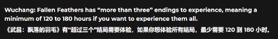 除此之外,此前在接受外媒GamingBolt采访时,官方称《明末:渊虚之羽》有超过三个以上的结局,这意味着如果玩家想体验全部的内容,至少需要120至180小时。当然,一切内容应以游戏内为准,敬请期待。