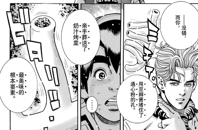 但刘昴星的料理可也不止这么简单。众所周知,要让一样事物升值,那必须得会讲故事,什么成功人士标配、商务精英甄选、小众好物推荐……放到料理界那也一样,刘昴星这道菜,餐盘是整个个体,饺子是其中的细胞,通心粉那奇特的形状则表现出DNA双螺旋结构,其余的各种配料也能一一对应上各种身体结构,简直是“在奶汁烤菜中构建出动态平衡,展示出生生不息代代相传的生命光辉”——这段什么什么生命光辉,可不是我胡逼的,这真是漫画原文。