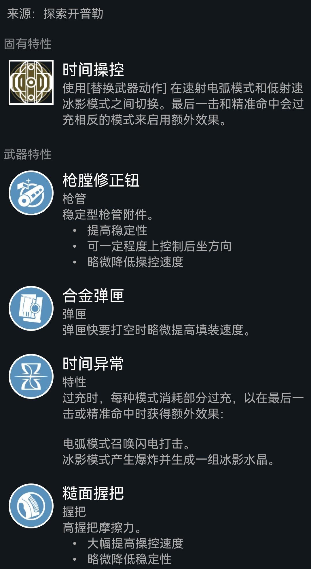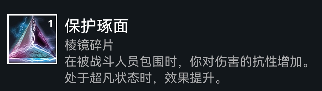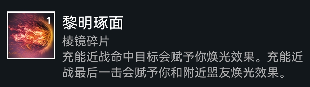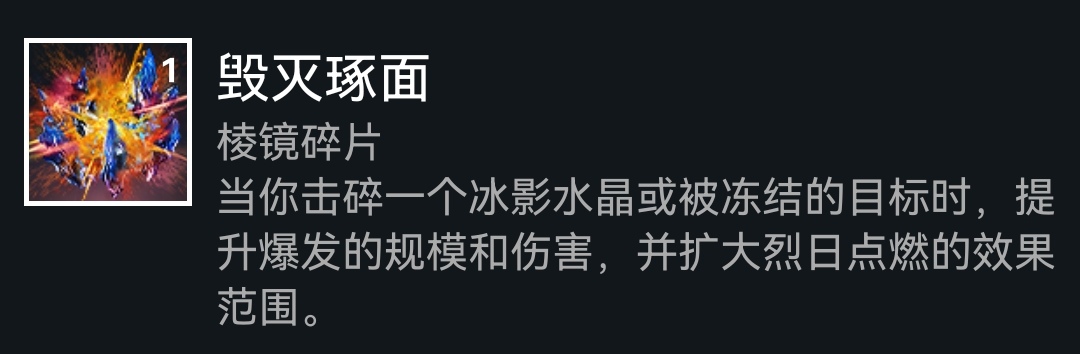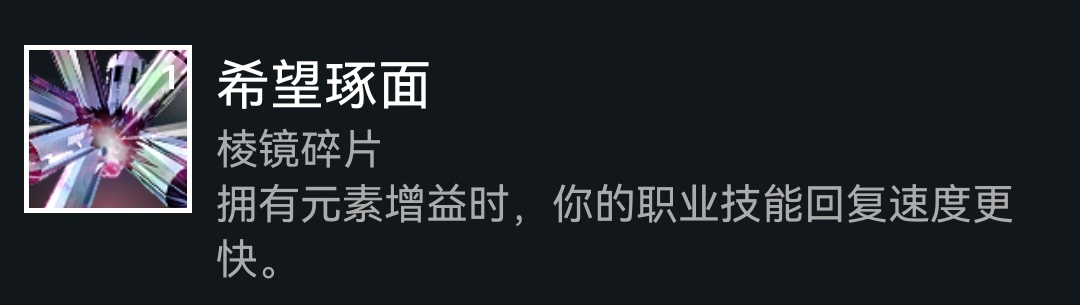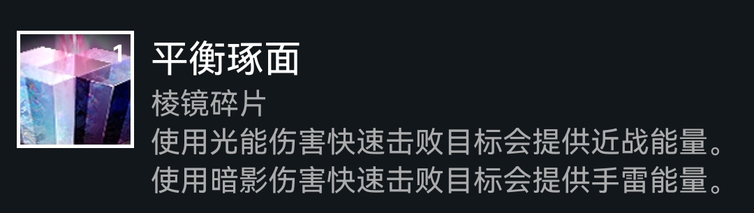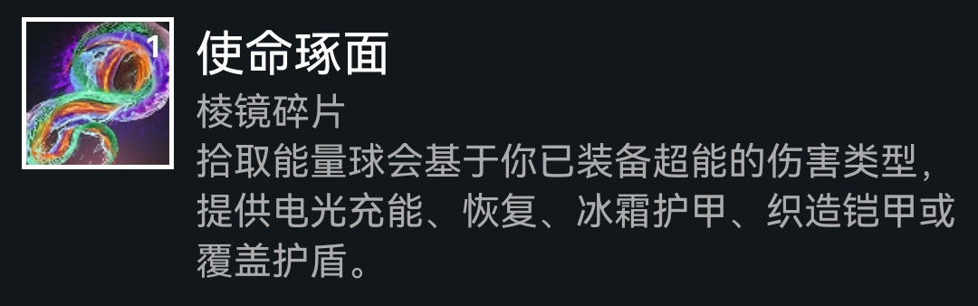 下面是碎片,依旧老三样(使命、保护、希望),如果选择赌徒闪身刷近战,可以选择黎明琢面获得常驻焕光,再提供20%武器增伤,或者选择平衡琢面加快技能回转,武器本身产冰,也可以选择毁灭琢面增加碎裂伤害,这套配装是比较多元化的,可以多多尝试
