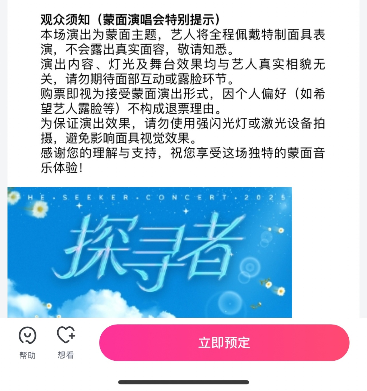 其实如果是一场普通的演唱会也就不值得说道,但是小旗认为此演唱会比较有意思的一点是在购票平台的有这样一段特别提示写明:“本场演出为蒙面主题,艺人将全程佩戴特制面具表演,不会露出真实面容,敬请知悉。演出内容、灯光及舞台效果均与艺人真实相貌无关,请勿期待面部互动或露脸环节。购票即视为接受蒙面表演形式,因个人偏好(如希望艺人露脸等)不构成退票理由。”