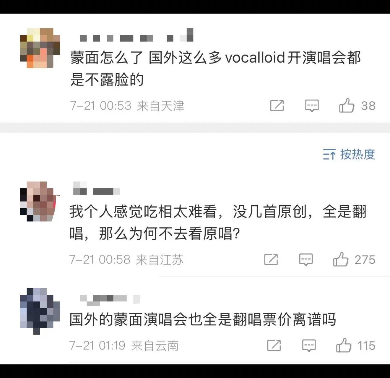 由热度其实可以看出,广大网友们已经开始有点反感了(。•ˇ‸ˇ•。),网友们提出了种种质疑包括:戴着面罩不露脸、全程无互动,连真唱假唱都分不出来,中途换人也许都行。缺乏原创歌曲,歌曲几乎全是翻唱,开个演唱会票价直逼一线歌手,还区分内外场。。