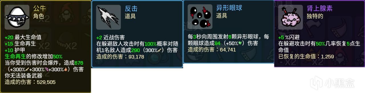 先來看公牛的特性,生命再生的屬性是1.5倍加成,三種傷害都是3倍加成。所以不拿獻血的話我們前面拿道具就直接從這兩個方面入手。