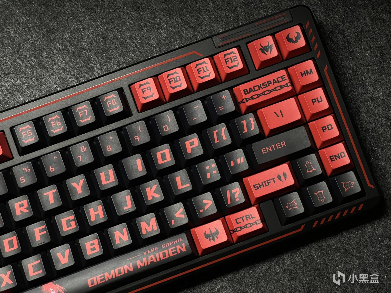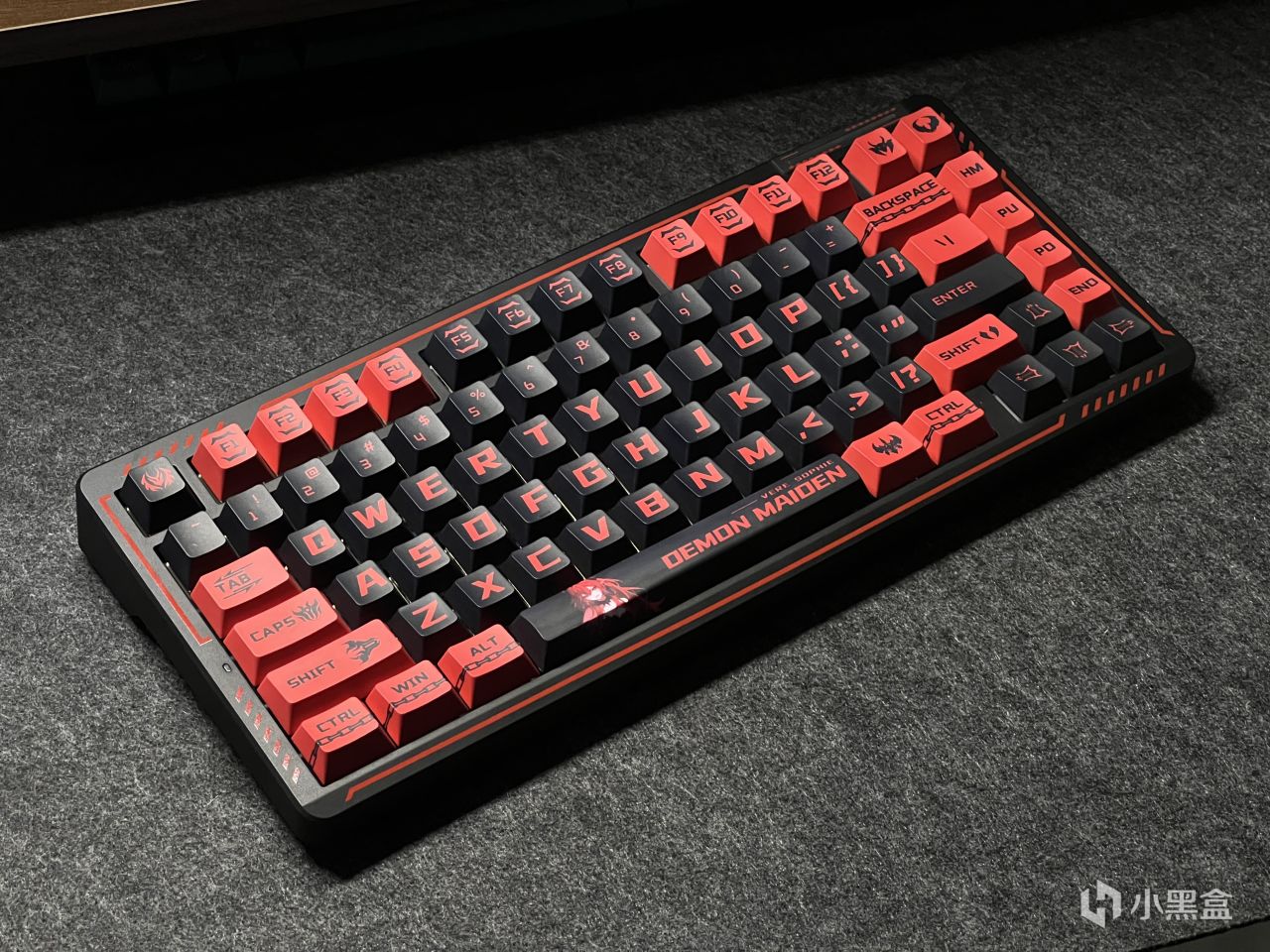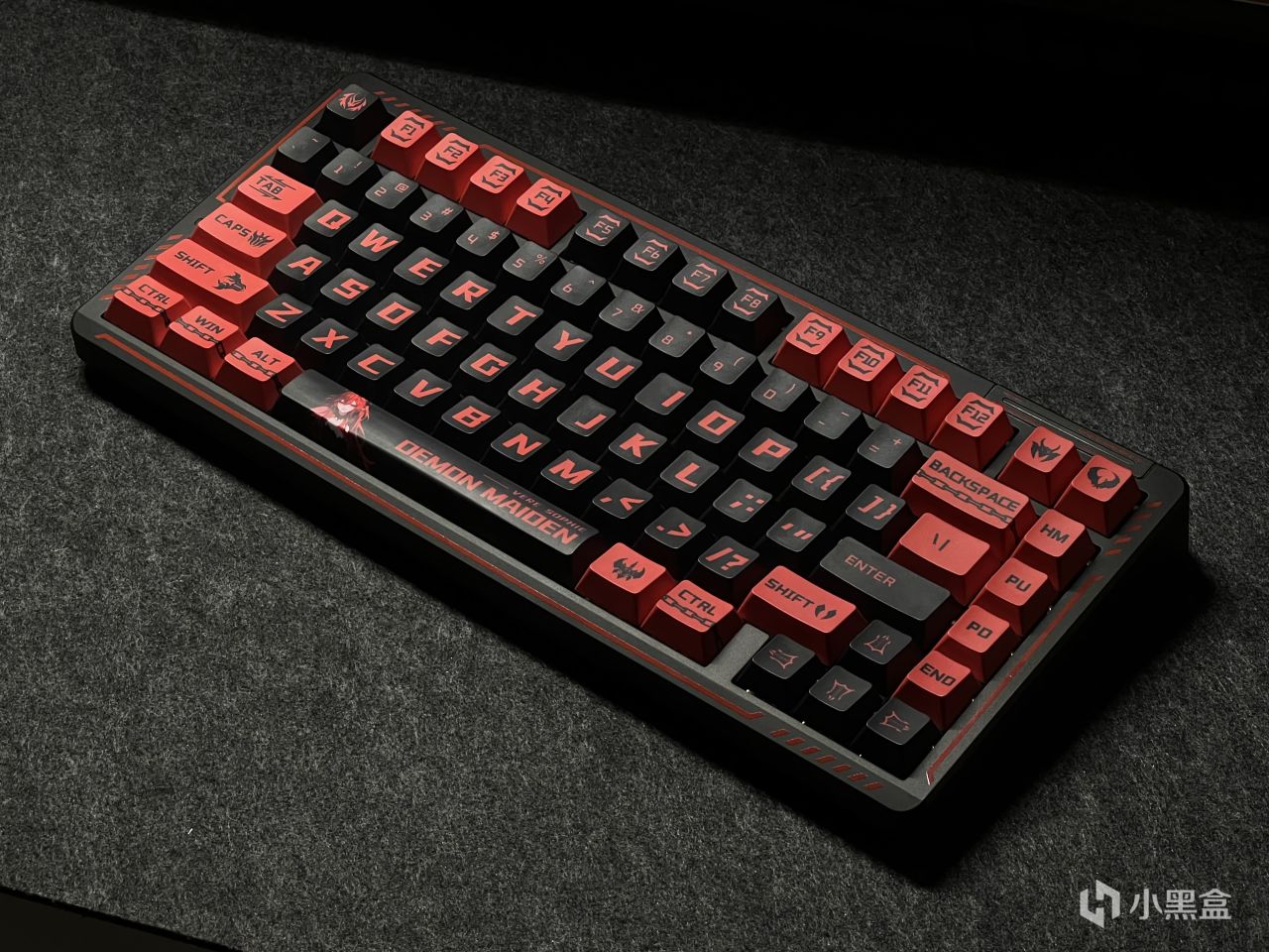 黑红的配色确定基调的同时,PBT材质的五面热升华键帽上还有恶魔标志和翅膀以及锁链等元素,搭配上背面的小恶魔映画,可以说是氛围感拉满。
