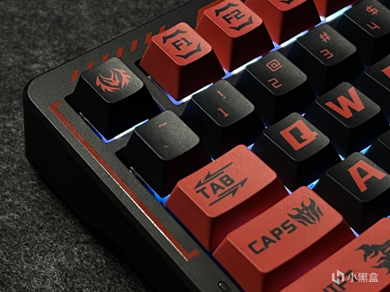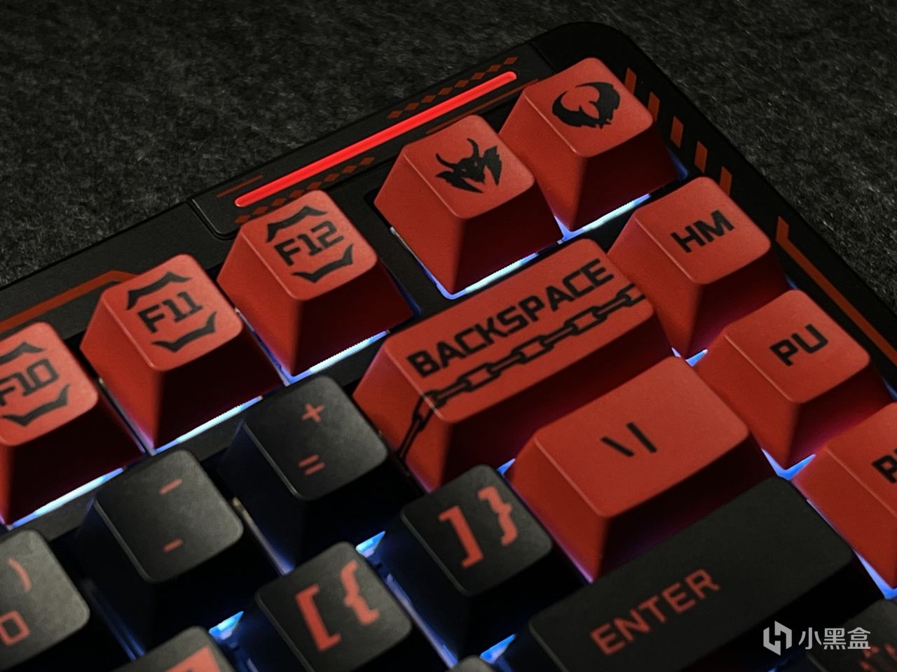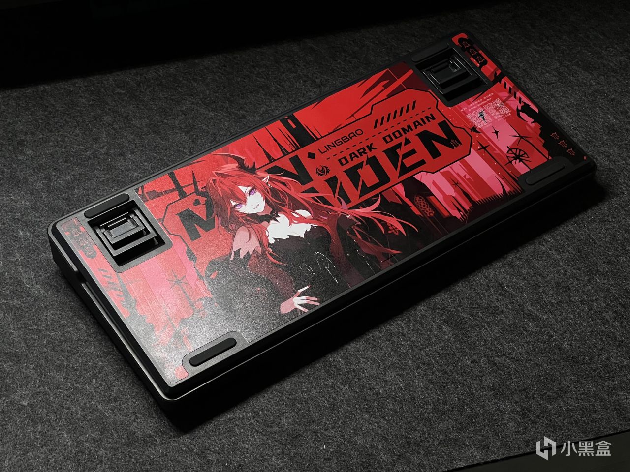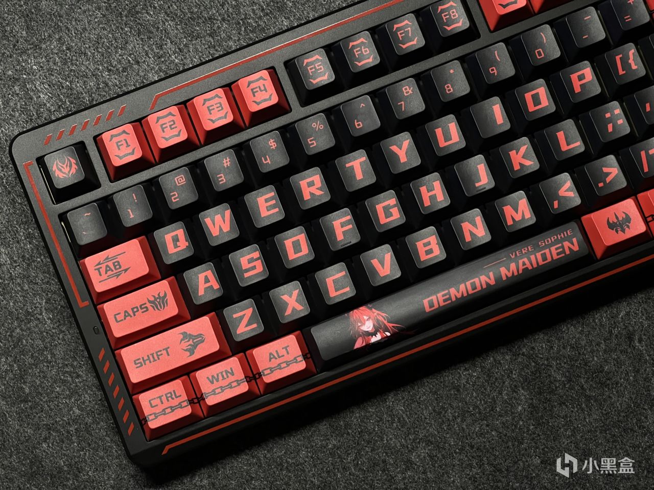 黑红的配色确定基调的同时,PBT材质的五面热升华键帽上还有恶魔标志和翅膀以及锁链等元素,搭配上背面的小恶魔映画,可以说是氛围感拉满。
