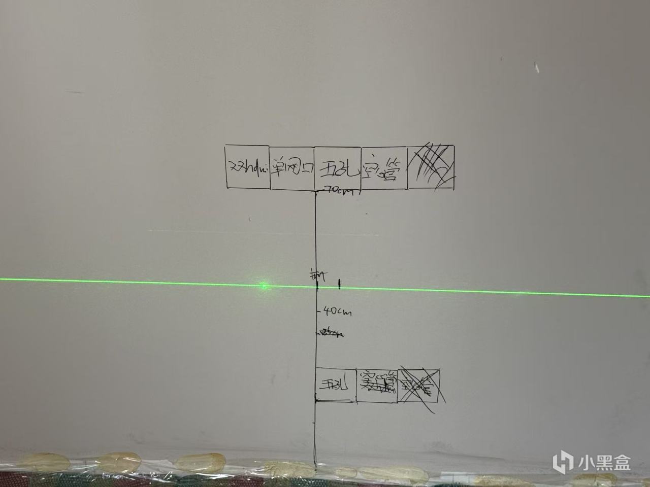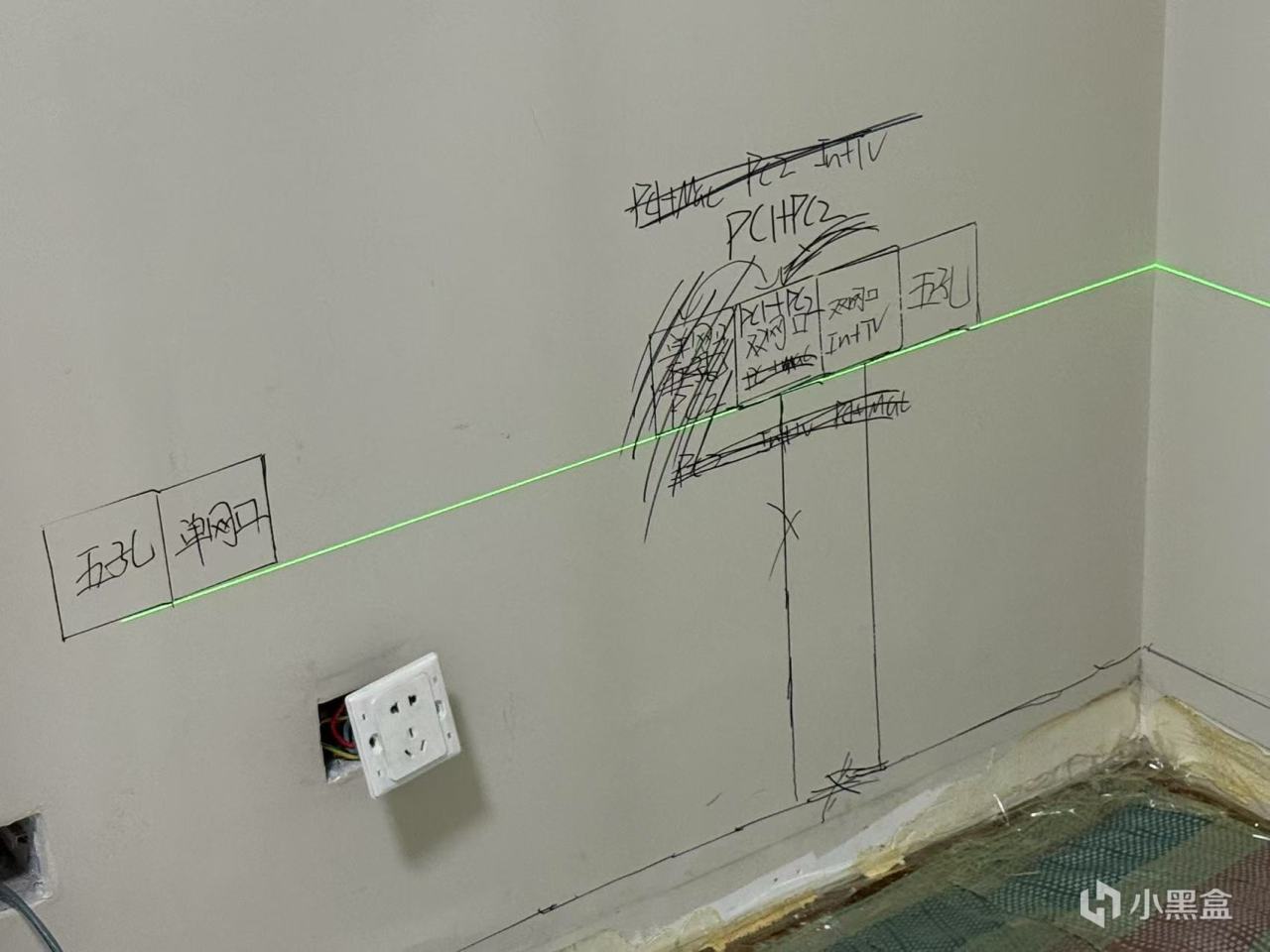 主包的小屋原来的插座不够多也不够合理,需要重新开槽埋线。主包去叔叔家里借了一台激光水平仪,重新在屋内花了插座位置(画的时候有点猪脑过载),都是50cm向上,因为主包设计的桌子高度是75cm, 这个高度的线盒刚好可以做到线材隐形的效果,也不至于太贴桌子不好插设备。整体原则就是在主要用电设备和用网设备傍边放置五孔面板和网口面板。