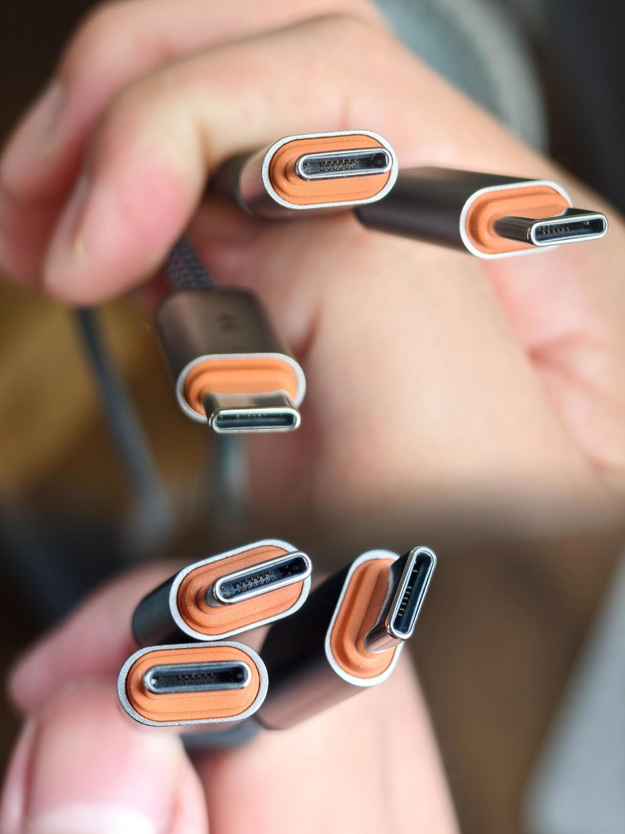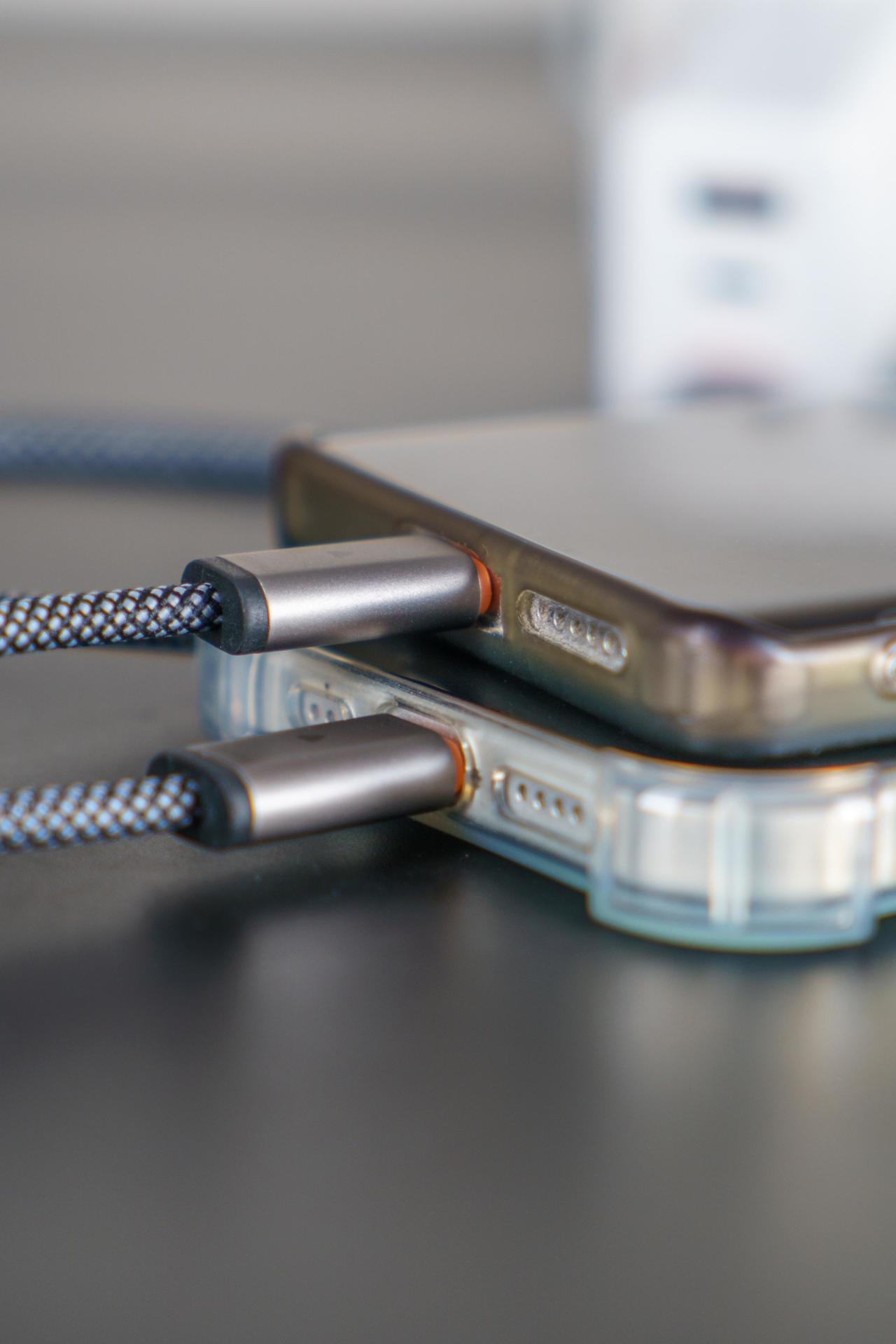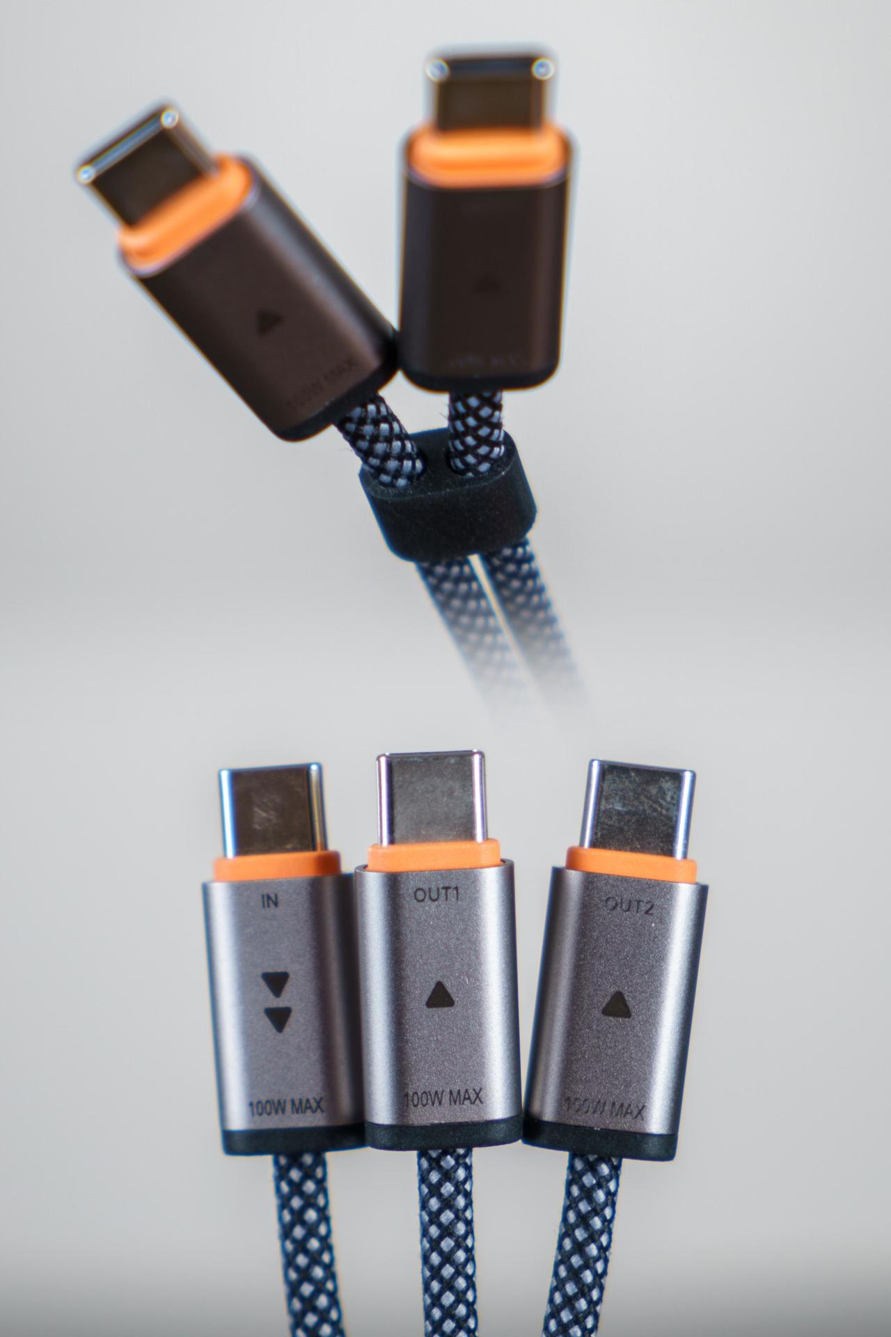 ▼它最高支持100W的输入和输出,接头外壳都是铝的,两根输出线之间还有可调节滑块设计,自由调节两根线分开的距离;type-c连接器后面是双层的设计,第一层为橙色塑料,第二层才是铝的外壳,为啥这么设计大家猜一下,后面会告诉你