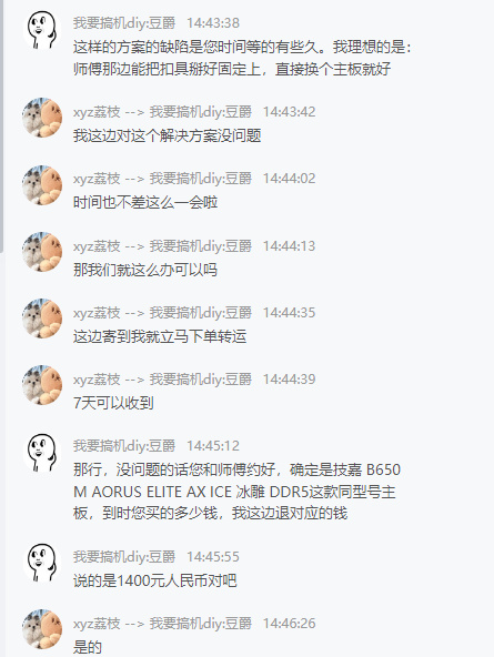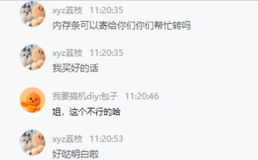 其他配置也很快確認好了。而粉絲自己買好了內存,想着寄給我們裝,我們覺得這個簡單沒必要,而且怕寄來寄去搞丟了說不清責任,就婉拒了: