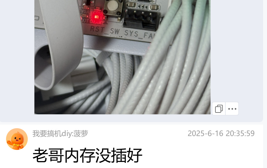 指導她重新插拔、換單根內存、主板放電,各種操作嘗試了,還是卡內存紅燈...