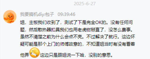 我們從國內補發散熱器扣具,主板她退給我們,她從上門師傅那兒買同款主板,等我們散熱器扣具寄到,一起裝好點亮: