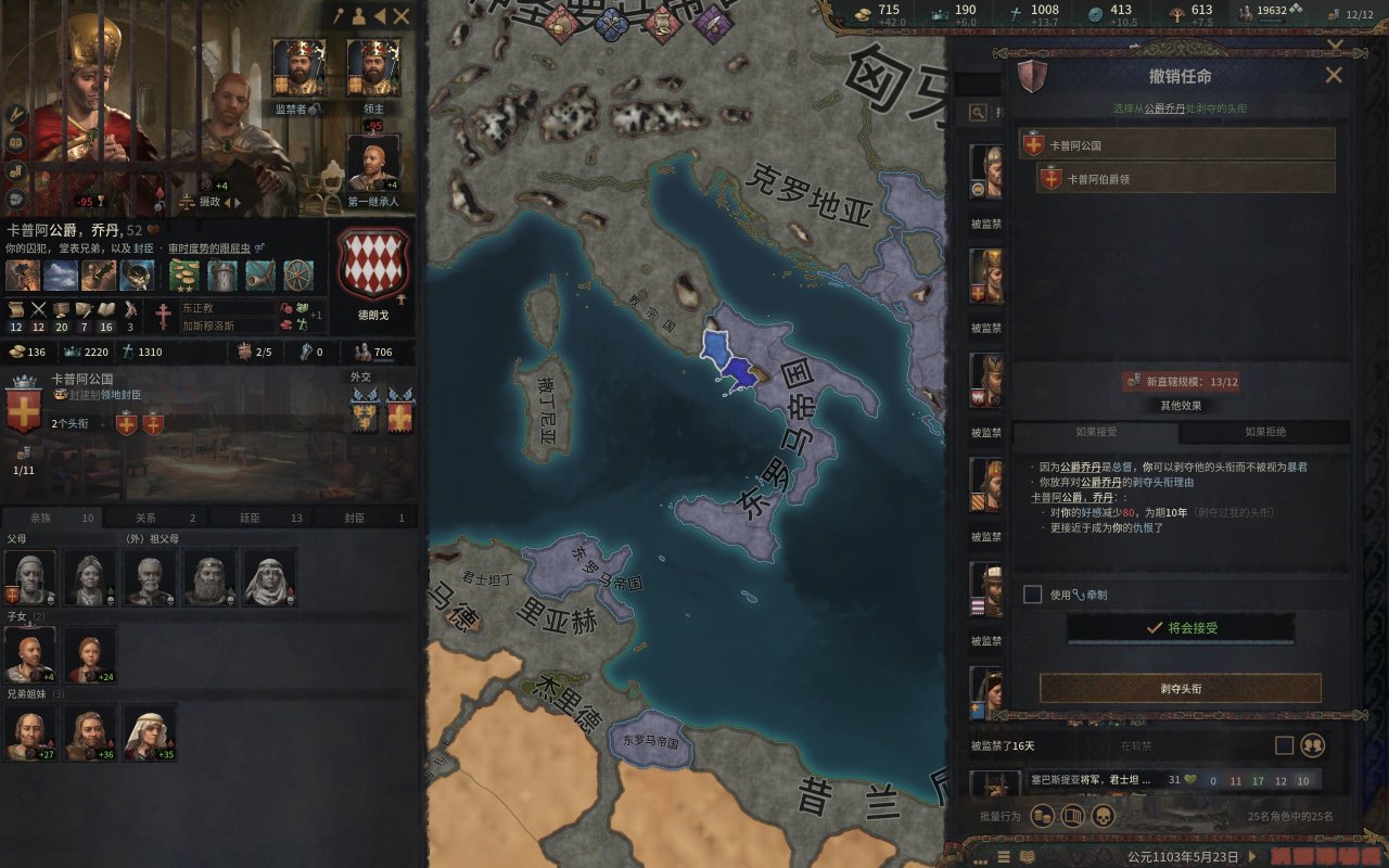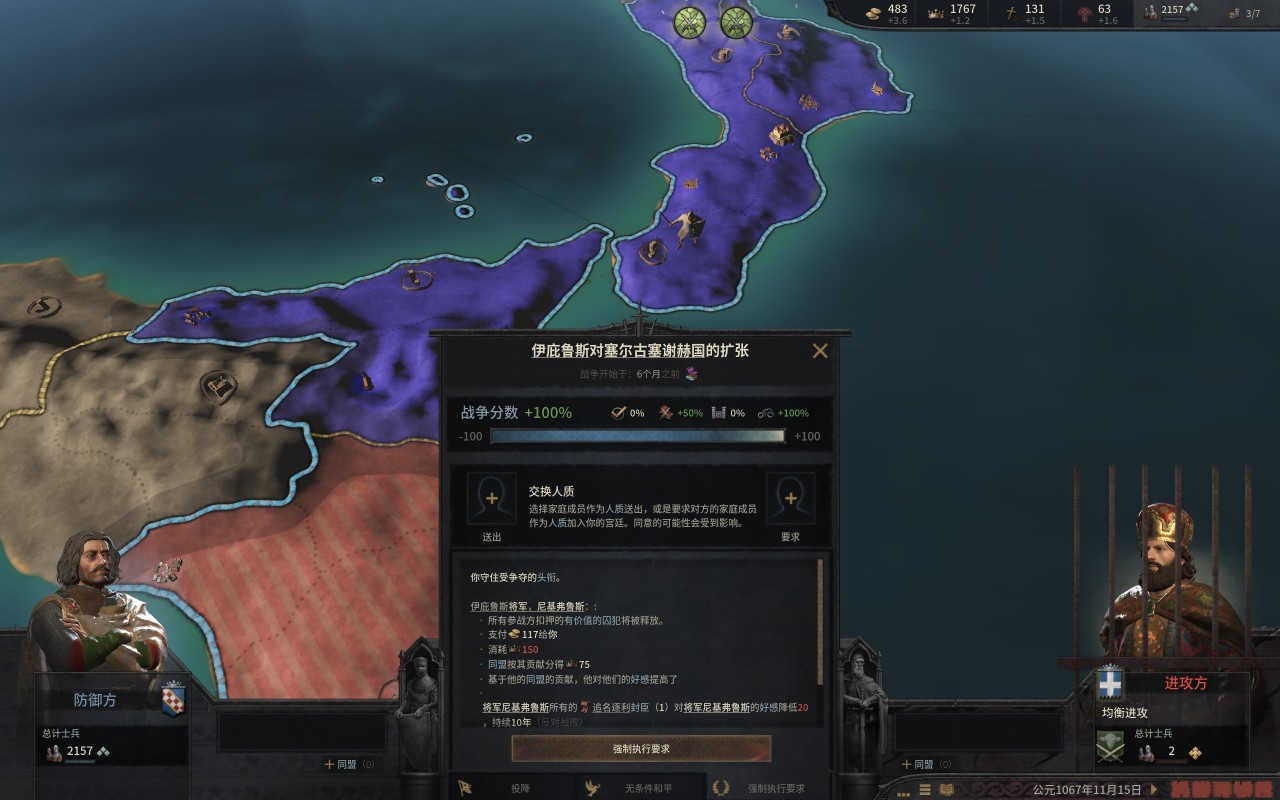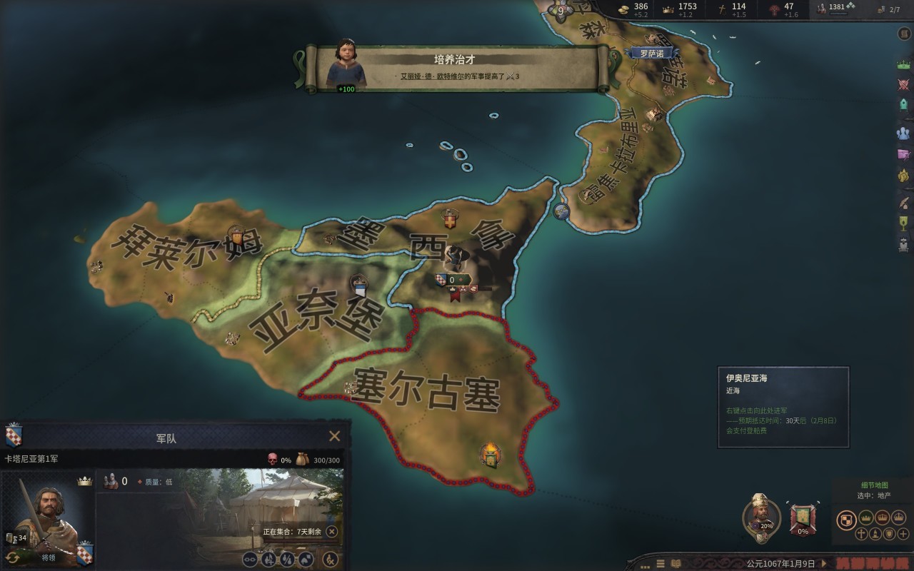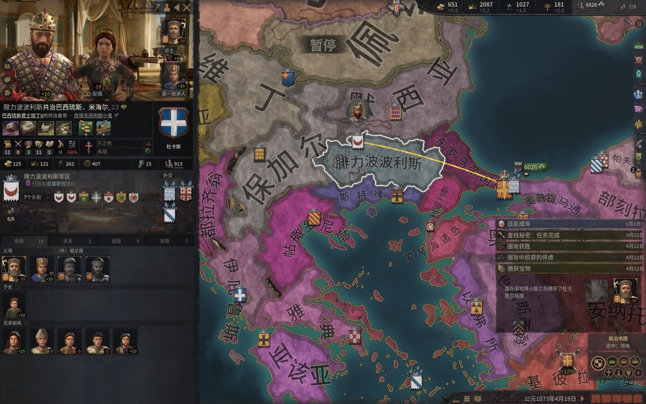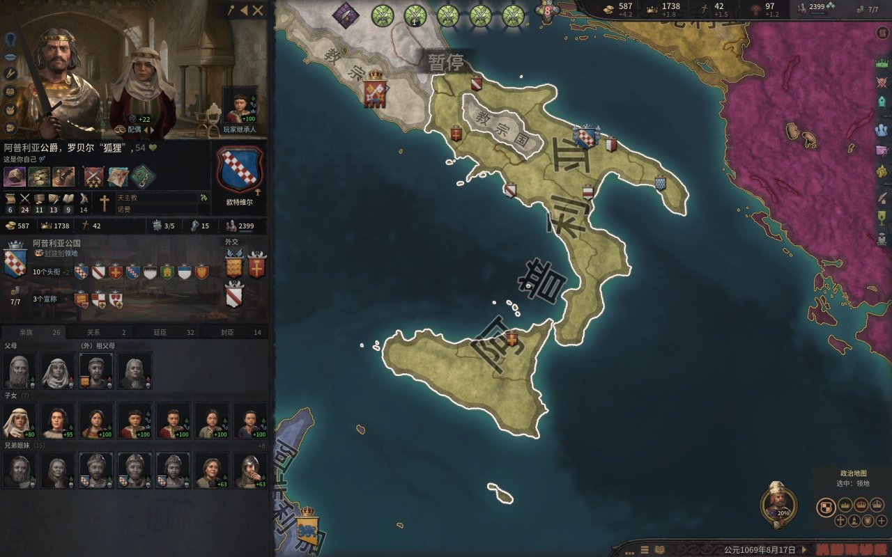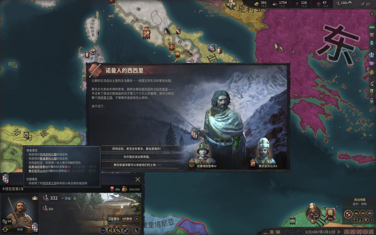 這個沒什麼可說的,先快速拿下西西里的綠教伯爵(尤其是錫拉庫薩),這不,伊庇魯斯將軍不遠萬里給咱們送錢來了。然後順便把貝內文託等地的宣稱拿了,當然,拉攏教宗的工作也不要停,前期的軍費有不少是要教宗報銷的。